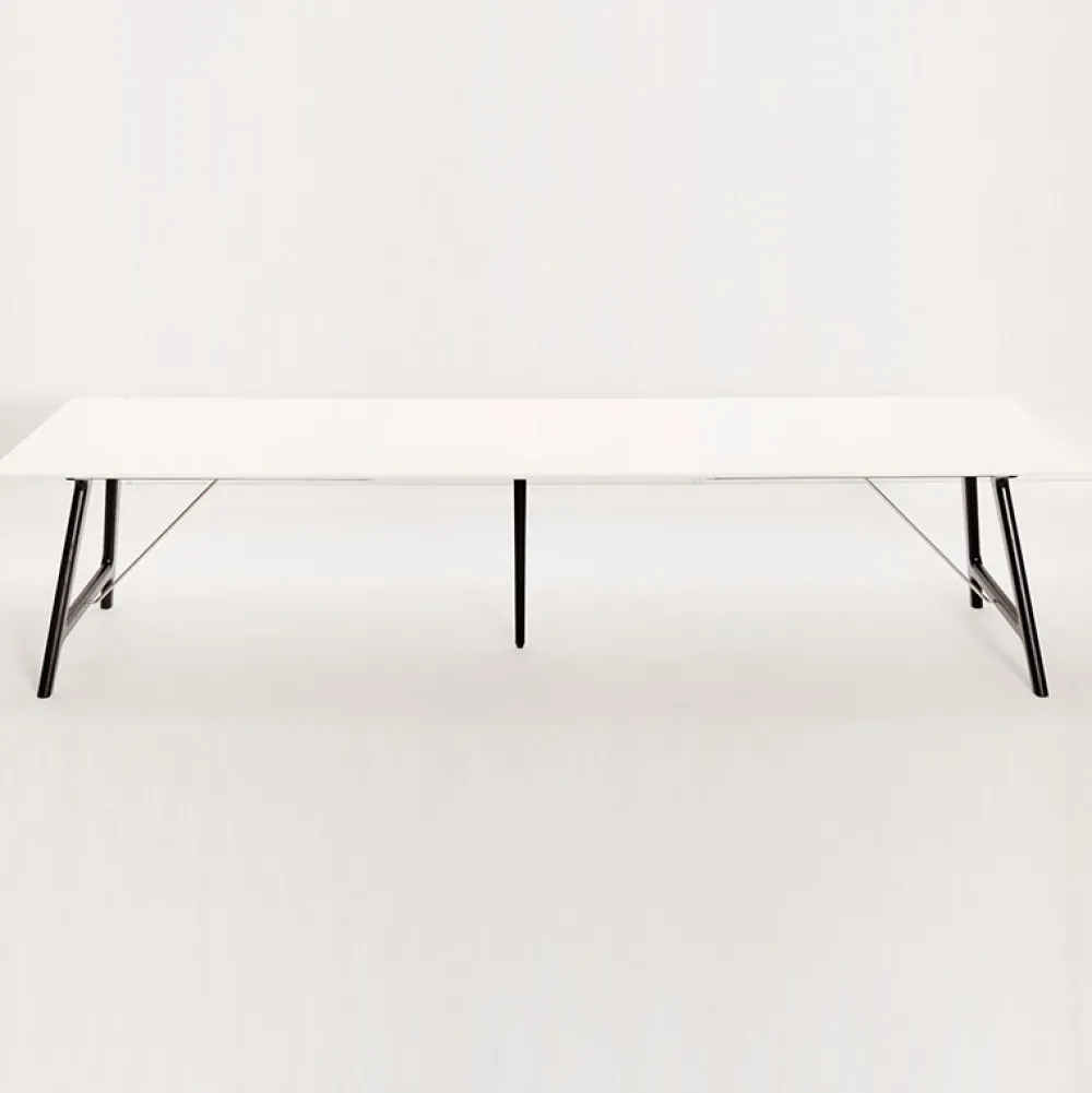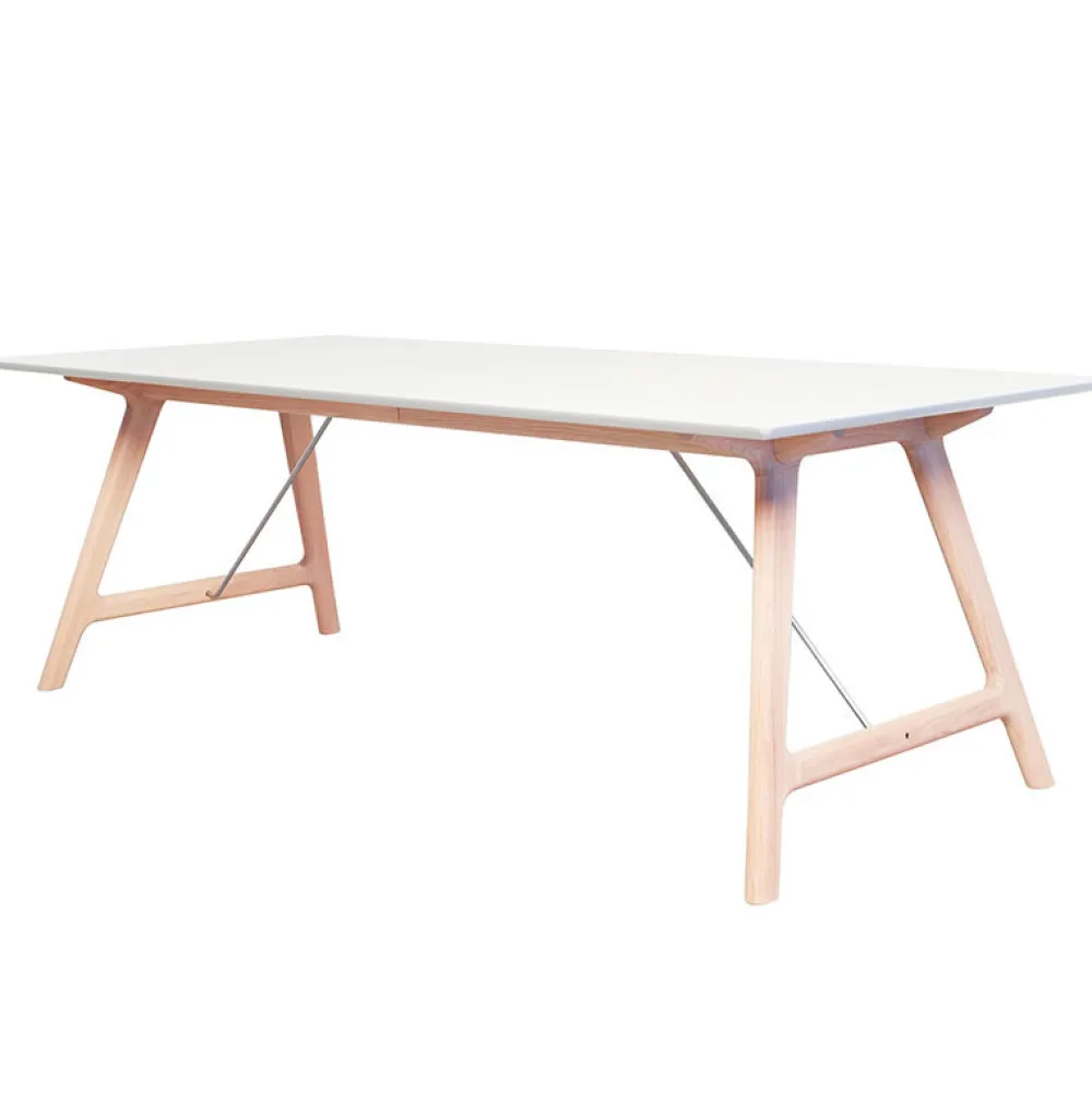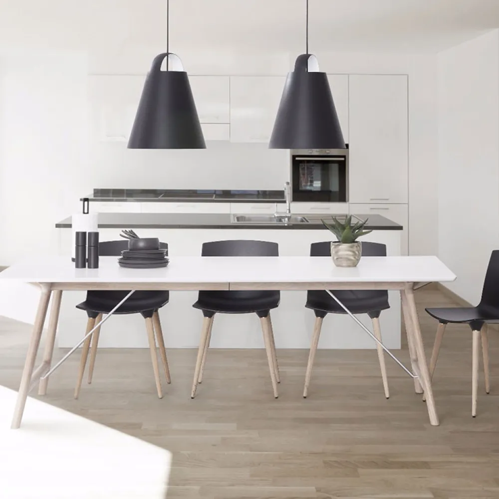 Bordpladen er fremstillet af gennemfarvet hvid laminat og understellet er i massivt eg. Udtræksbordet er behandlet med Wood Care overfladebehandling, som kræver minimal vedligeholdelse. Der er udtræk til tillægsplader, som let isættes og hurtigt giver ekstra plads ved bordet.