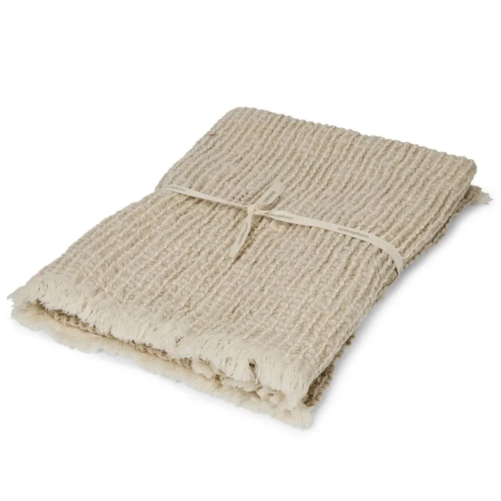 Enkelt og tidløst håndklæde, der balancerer mellem funktionalitet og elegance. Håndklædet er en skøn kombination af bomuld og hør, hvilket resulterer i en formidabel tørreevne og en skøn, luksuriøs blødhed. Qua vaffelstrukturen og garment-wash behandlingen bringer håndklædet et afslappet, men sofistikeret spa-udtryk, som både er stilfuldt og skønt.