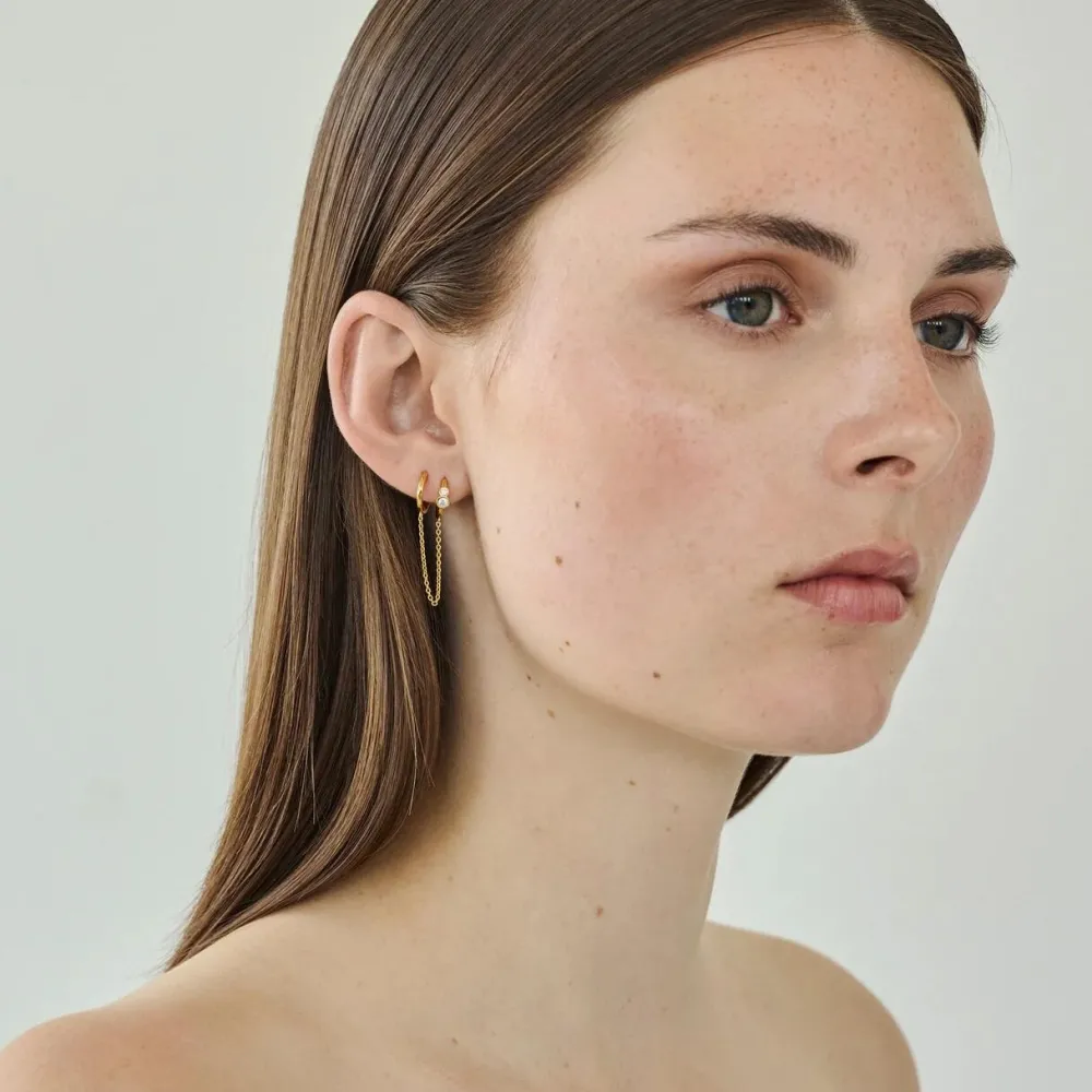 En moderne fortolkning af klassiske hoops – dog med et kunstnerisk og legende twist. Øreringene består af to små, blankpolerede hoops forbundet af en fin kæde, der skaber illusionen af to separate øreringe, men i virkeligheden er ét samlet design. Den ene hoop er prydet med to funklende zirkonia-sten, som tilfører et elegant og feminint spil. Skabt til øret med to huller, forener øreringene det rå og det raffinerede i et unikt udtryk. Øreringene har praktisk kliklås, der gør dem nemme og sikre at bære.