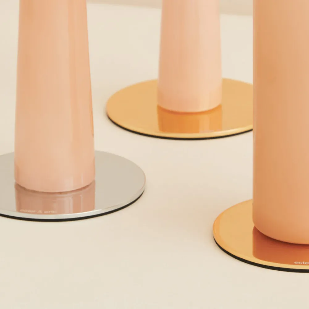 Rund platte, som er fremstillet i et enkelt og stilfuldt design, der står flot til alle de håndlavede lys fra Ester & Erik. Platten benyttes særligt i kombination med kegle- og bloklys. Lyset fastholdes på platten af tre stifte i bunden, hvorved alle lys kan stå stabilt. Desuden er der tilført skum på bagsiden af platten for herved at skåne underlaget. Som overfladebehandling er der anvendt PVD, hvilket er en ny miljøvenlig måde at coate metaller på, som samtidig giver en suveræn kvalitet og finish.
