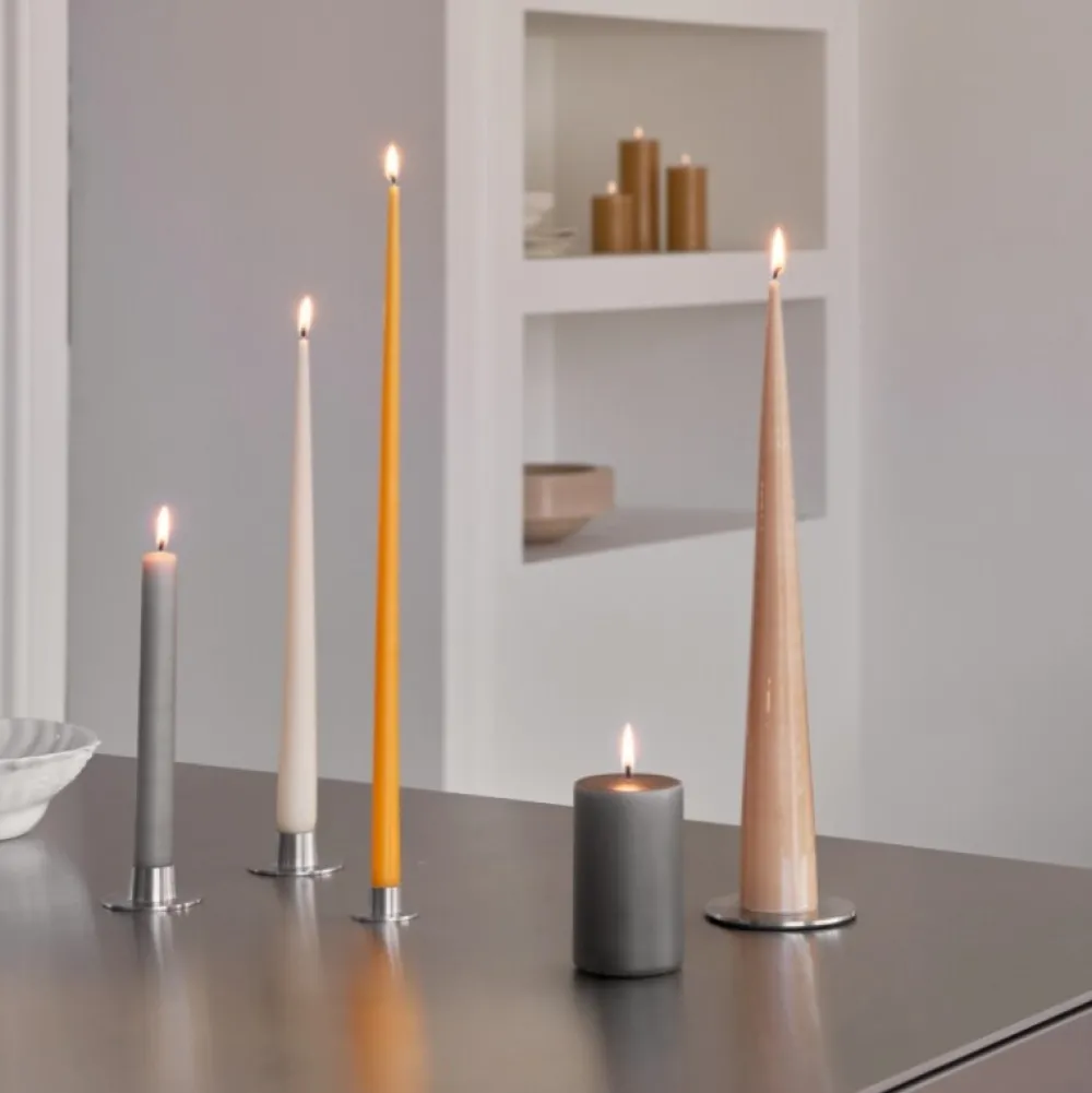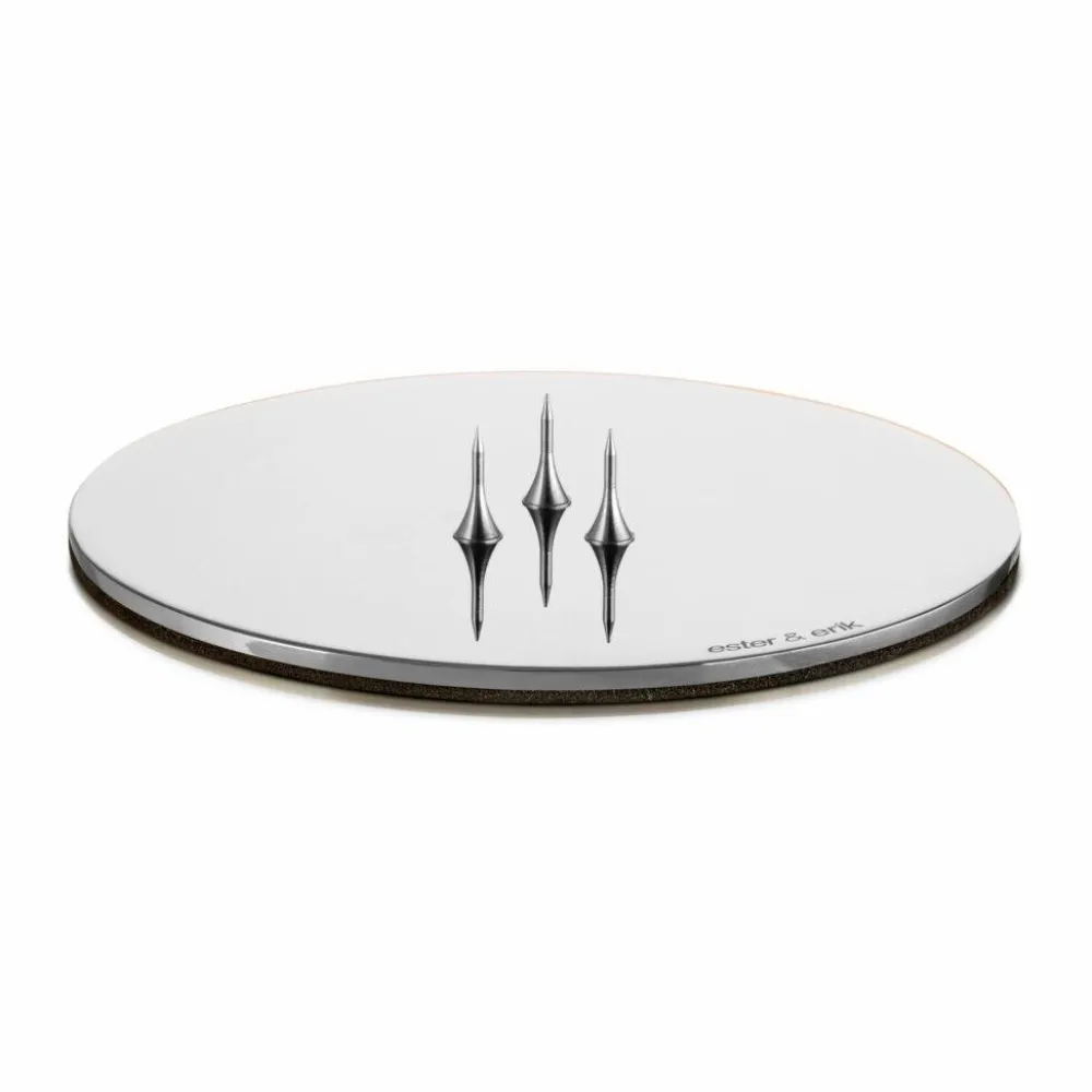 Minimalistisk og tidløs platte i det fineste, klassiske design. Platten er ideel til de håndlavede lys fra Ester & Erik – i særdeleshed til kegle- og bloklys. Lyset fastholdes på platten af tre stifte i bunden, hvorved alle lys kan stå stabilt. Desuden er der tilført skum på bagsiden af platten for herved at skåne underlaget. Som overfladebehandling er der anvendt PVD, hvilket er en ny miljøvenlig måde at coate metaller på, som samtidig giver en suveræn kvalitet og finish.