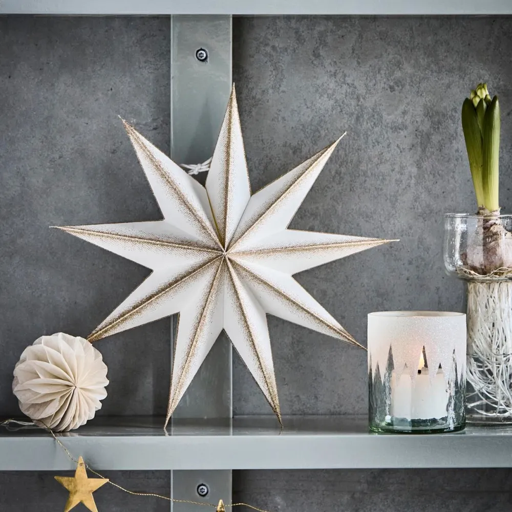 Yndefuld stjerne, der på fineste vis spreder julestemning i hjemmet. Den ni-takkede form forener moderne design med klassisk julehygge og skaber en fortryllende atmosfære i ethvert rum. Stjernen kan monteres med en lyskilde for at sprede et varmt og stemningsfuldt lys. Hæng den alene som et elegant blikfang, eller kombiner flere størrelser for et imponerende og harmonisk udtryk. Et eksklusivt og tidløst designelement, der tilfører juleudsmykningen både elegance, glans og en snert af eventyrlig magi.