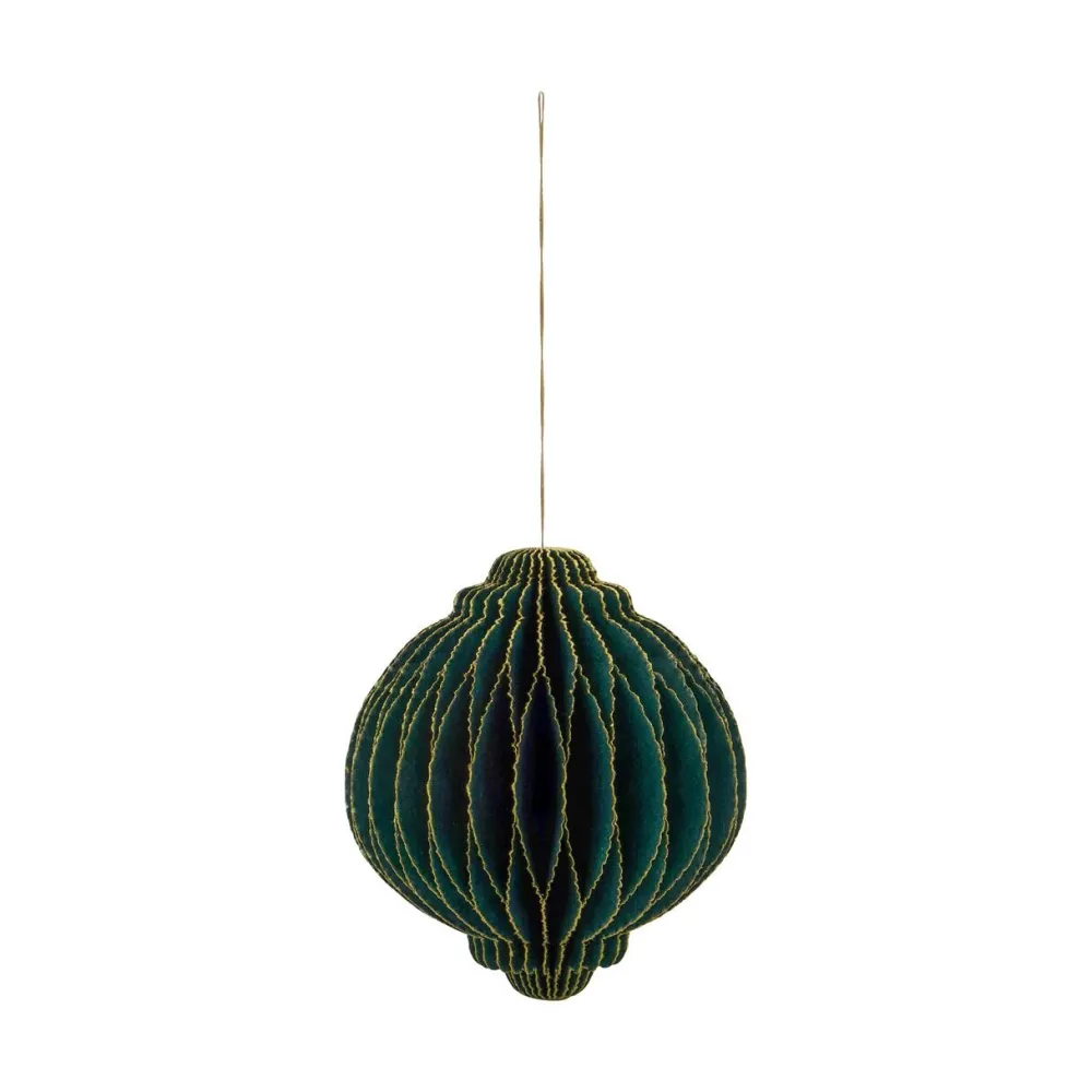 Elegant papirsornament, der bringer et et strejf af klassisk julestemning og håndværksmæssig finesse ind i indretningen. De smukt foldede former med delikate kanter og gyldent glimmer reflekterer lyset på fortryllende vis og tilfører et eksklusivt udtryk til enhver dekoration. Ornamentet kan hænges på grene, juletræer eller anvendes som en stilfuld detalje i et fad eller på et festligt dækket bord. Den lette og holdbare polyestertråd gør den nem at placere og genbruge sæson efter sæson.