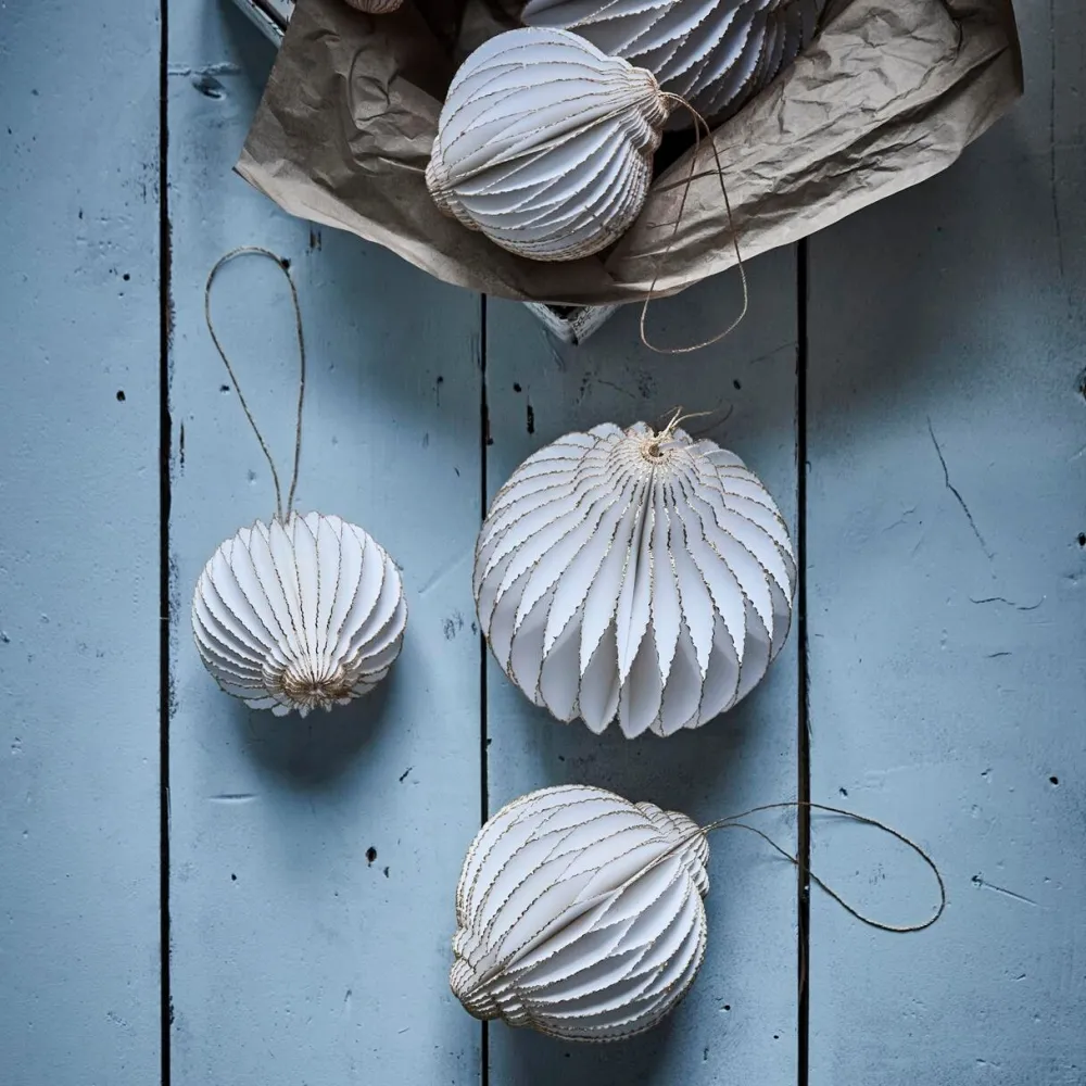 Tidløst papirsornament i et raffineret og luksuriøst design. Ornamentet med fine guldkantede detaljer fanger lyset smukt og skaber en stemning af varme, ro og festlig elegance. Det er fremstillet med sans for kvalitet og balance mellem enkelhed og glans. Papirsornamentet er yderst velegnet til ophæng på grene, juletræer eller som dekorativt element i et stilfuldt arrangement. Den lette og holdbare polyestertråd gør den nem at placere og anvende igen sæson efter sæson. Ornamentet bringer et strejf af klassisk skønhed og forfinet julestemning ind i indretningen – en tidløs detalje, der fuldender ethvert festligt udtryk.