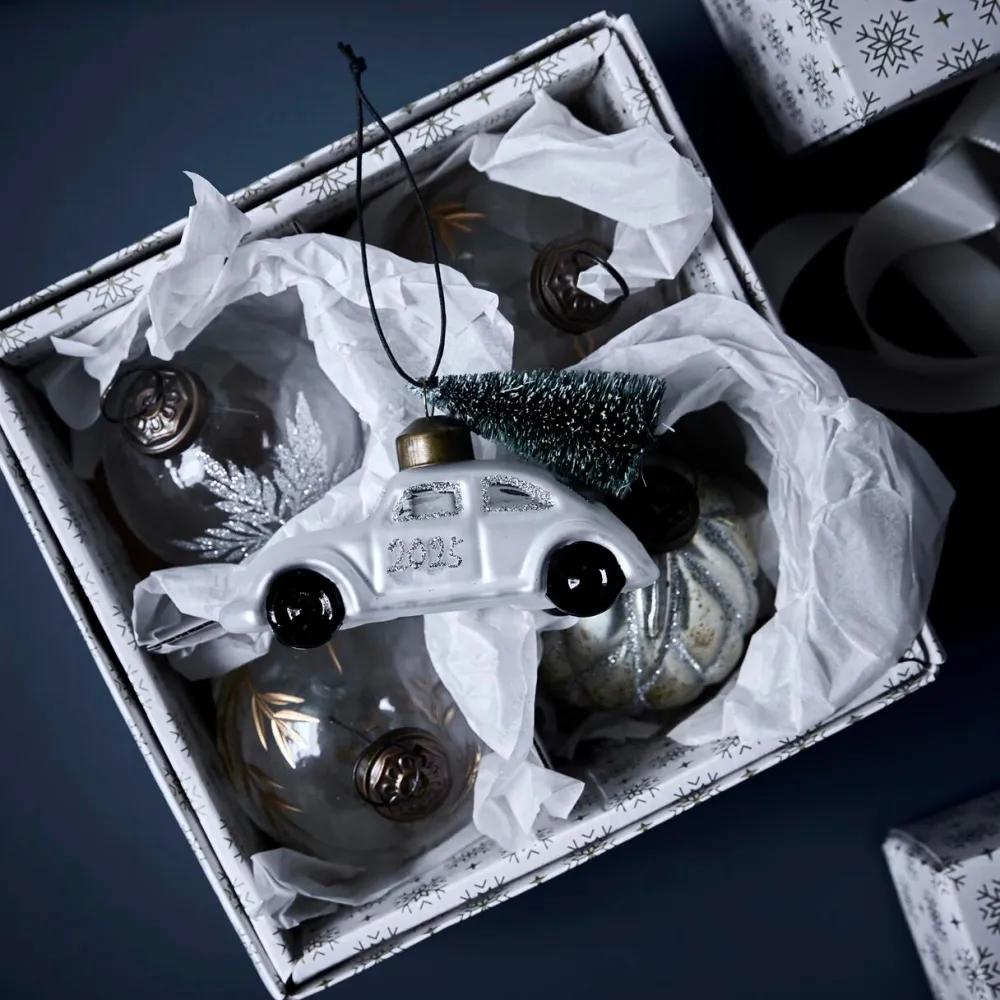 Oplev julens nostalgi med denne håndlavede, mundblæste julebil i glas. Den charmerende hvide bil er dekoreret med sølvglimmer og bærer et lille juletræ på taget – et symbol på den hyggelige tradition med at hente juletræet hjem til jul. Ornamentet er detaljeret med årstallet 2025 og bringer både varme og personlighed til din juleudsmykning. Et unikt ornament, der indfanger julens magi og spreder glæde år efter år.