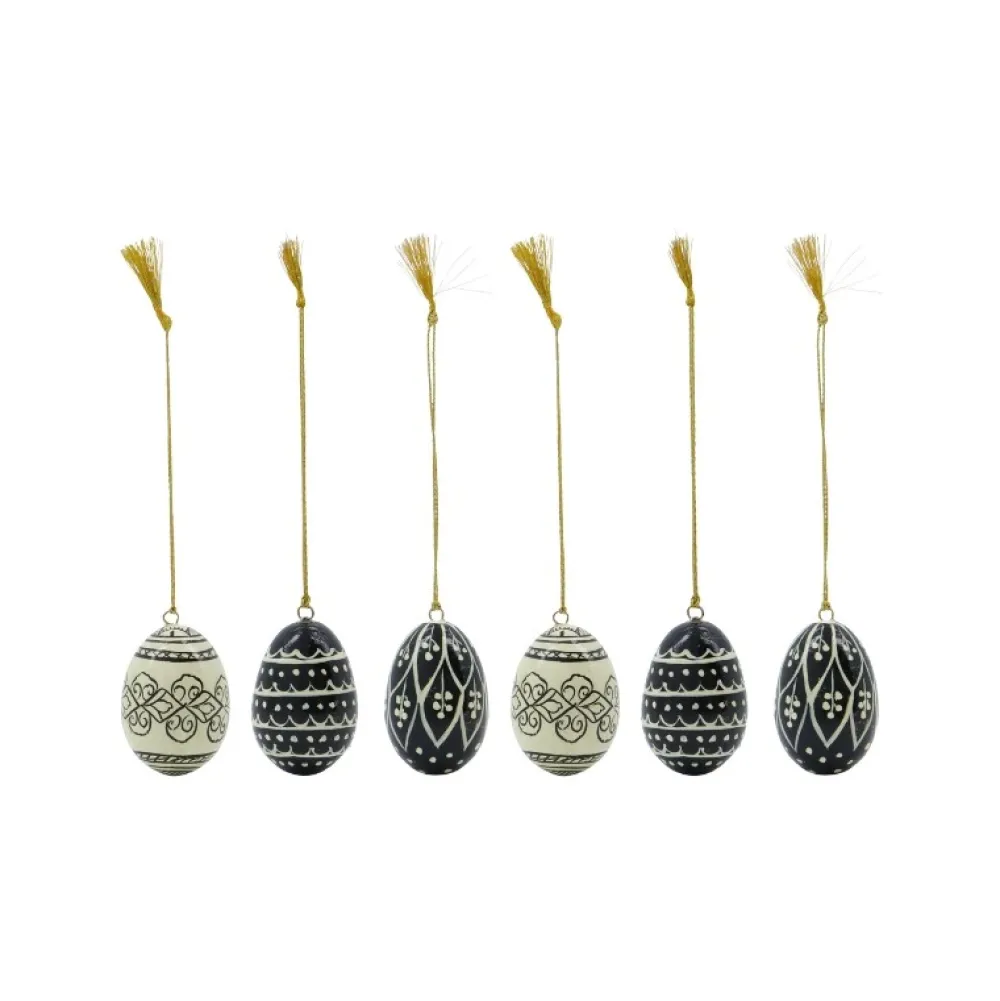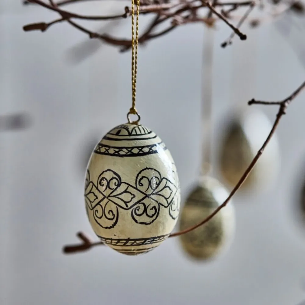 Elegante påskeæg, håndmalet med smukke mønstre. Påskeæggene vil helt sikkert tilføre lidt ekstra hygge og elegance til dit hjem i påsken. De er perfekte til at hænge på en gren i en vase, placere dem i en skål som en dekorativ detalje på bordet eller bare sprede dem rundt i hjemmet for at skabe en hyggelig påskestemning.