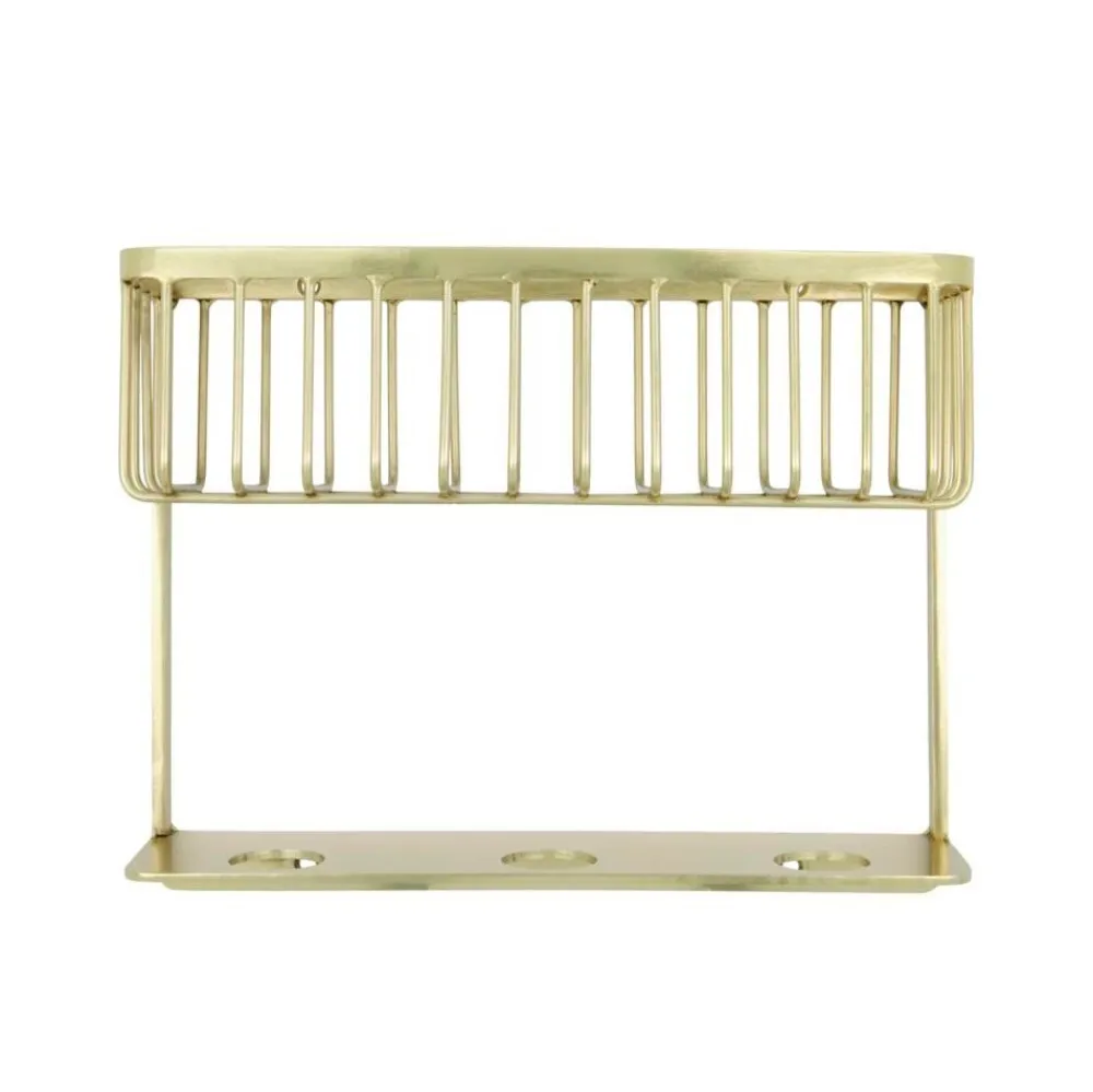 Hold badeværelset ryddeligt og produkterne inden for rækkevidde med denne hylde. Hylden er fremstillet af rustfrit stål og er udført med en messingfarvet overflade for at skabe et elegant og tidløst look. Designet udnytter pladsen bedst muligt med en kurv og en bøje, hvor der er plads til tre flasker. Hylden er ideel i brusekabinen, idet der både kan opbevares shampoo, balsam, scrubs og tilbehør herpå. En anden mulighed er at hænge den på væggen ved vasken, således der er nem adgang til hudplejeprodukter.