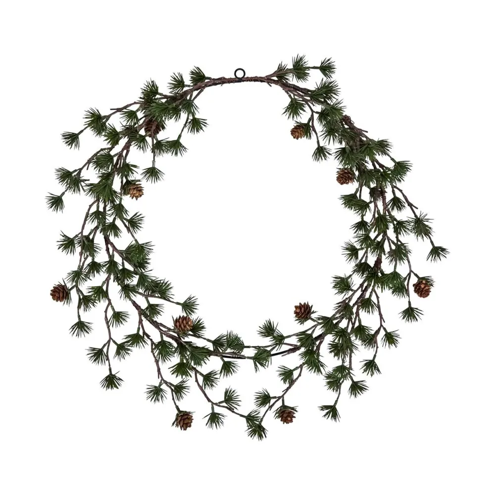 Fin og naturtro krans, der bringer julestemningen indendørs. Kransen er ideel at hænge på døre, i vinduer eller som dekoration både indendørs og udendørs. Julekugler og andre dekorationer kan tilføjes for et personligt og elegant udtryk. Den holdbare jernramme sikrer stabilitet og lang levetid, mens de naturtro detaljer giver kransen et flot og tidløst udseende sæson efter sæson. Kransen er alsidig og nem at integrere i både klassiske og moderne juledekorationer.