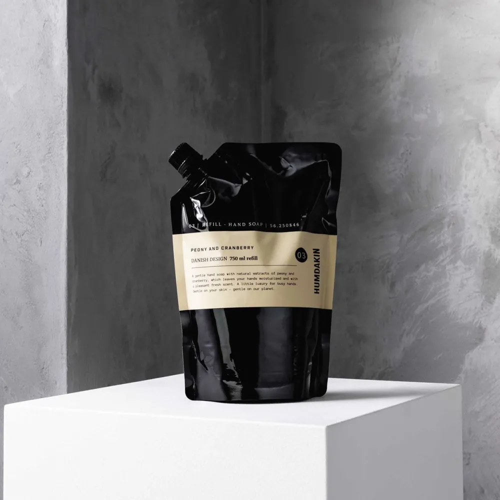 Enkel og praktisk refill-løsning, som muliggør genopfyldning af ens yndlingssæbe. Sæben er en skøn og mildt skummende håndsæbe med naturlig ekstrakt fra pæon og tranebær, som ikke blot efterlader hænderne bløde, men også med en dejlig, frisk duft.