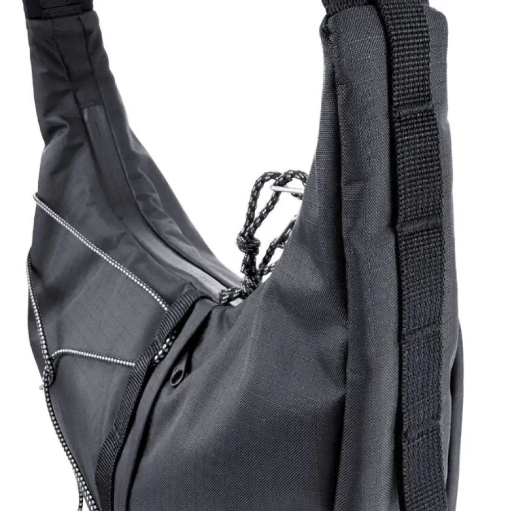Fronten er udstyret med en reflekterende elastisk bungee-snøre, som giver både synlighed i mørke og mulighed for ekstra opbevaring. Derudover finder du praktiske webbing-loops og en udvendig lynlåslomme til hurtig adgang til småting. Den justerbare skulderrem med hurtigudløser gør det let at tilpasse pasformen, og ekstra loops i siden øger taskens funktionalitet.