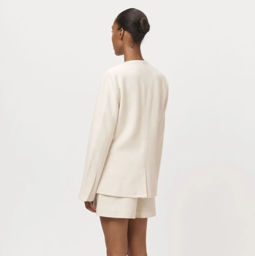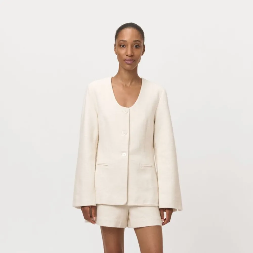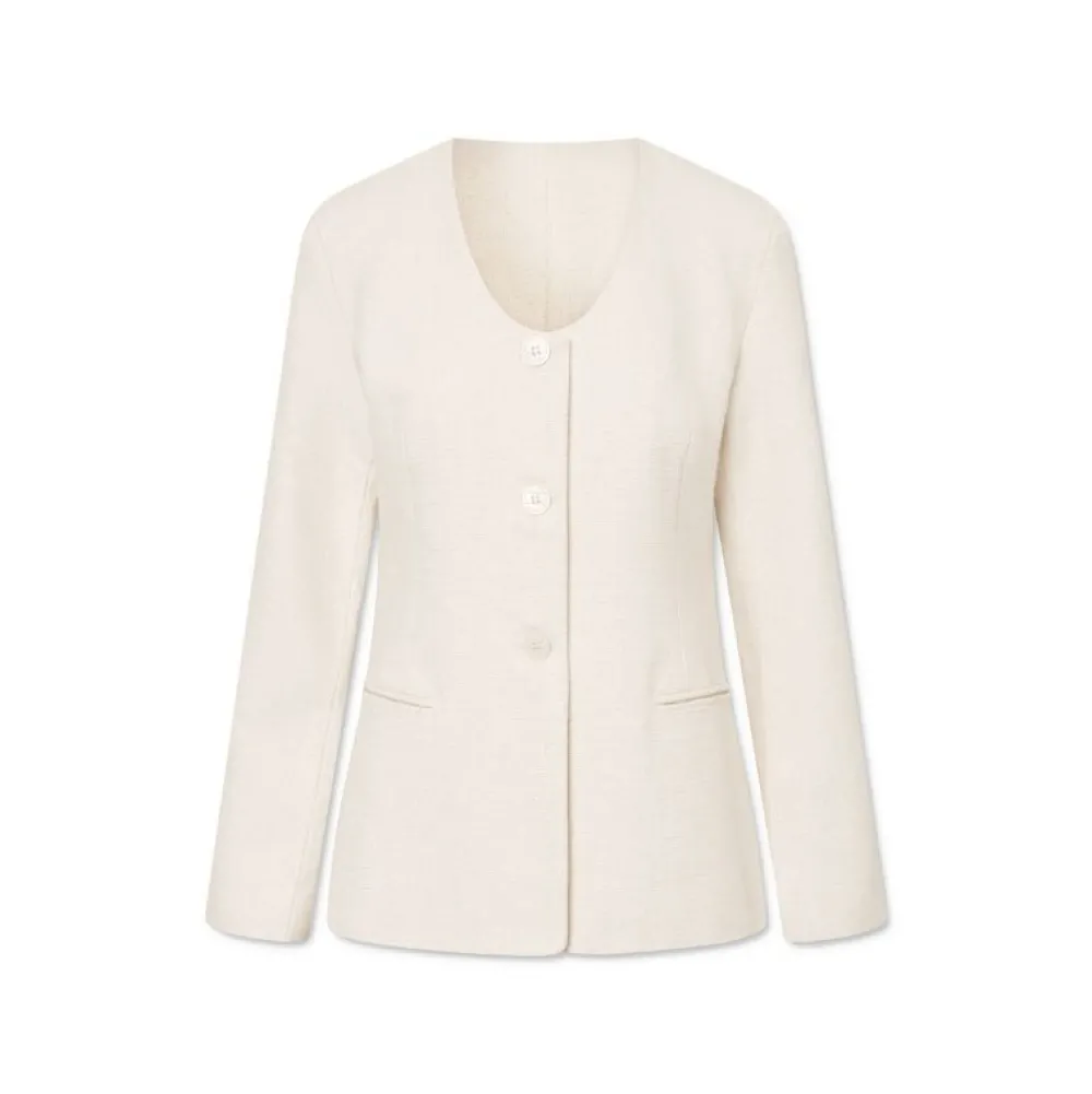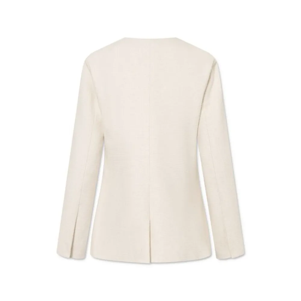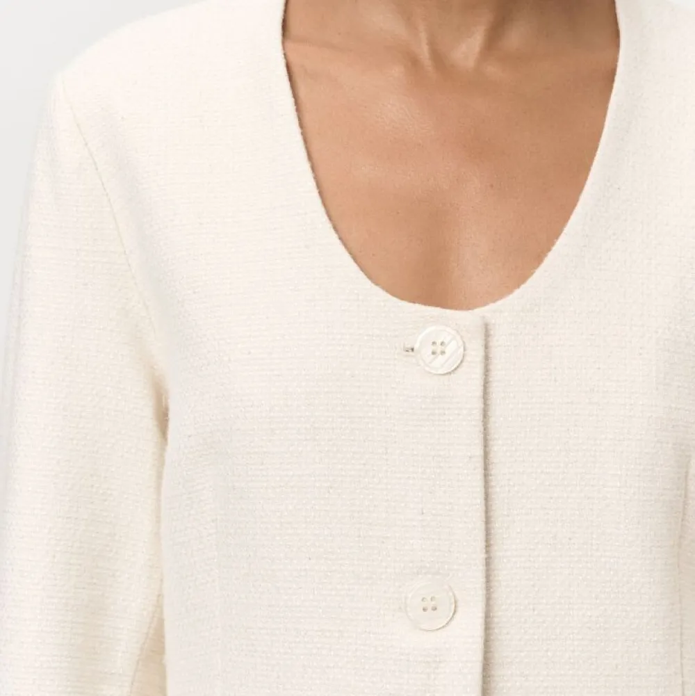 Denne smukke jakke kombinerer klassiske snit med feminine detaljer og er skabt i en let og åndbar blanding af 55% hør og 45% bomuld. Designet er karakteriseret ved en rund, dyb halsudskæring og en tætsiddende talje, som fremhæver figuren på elegant vis.