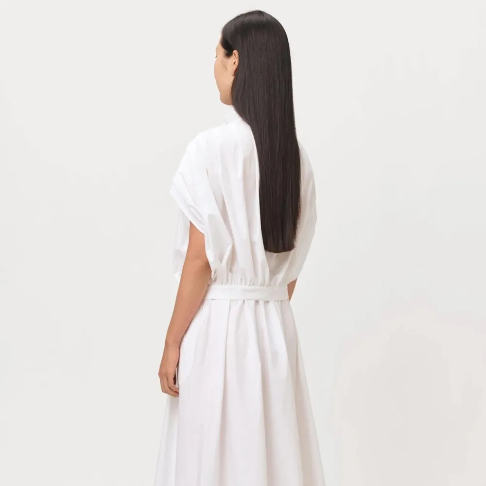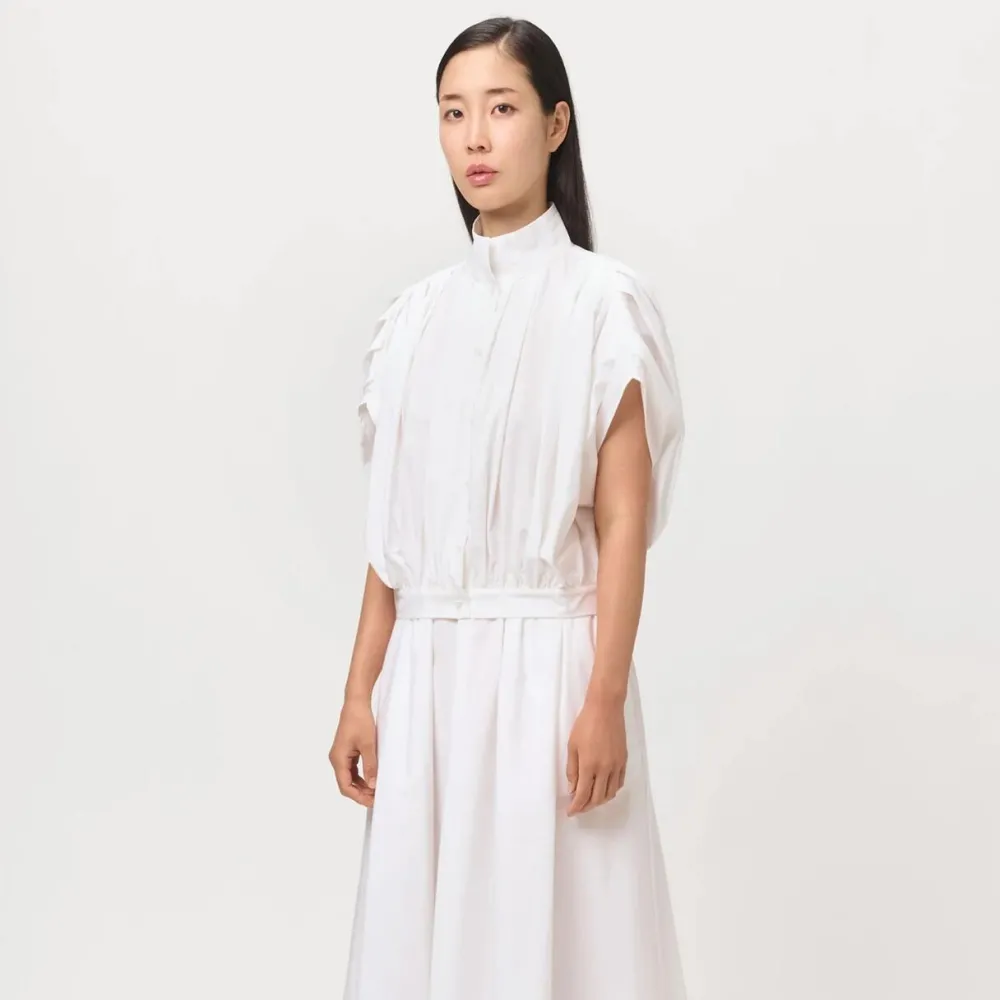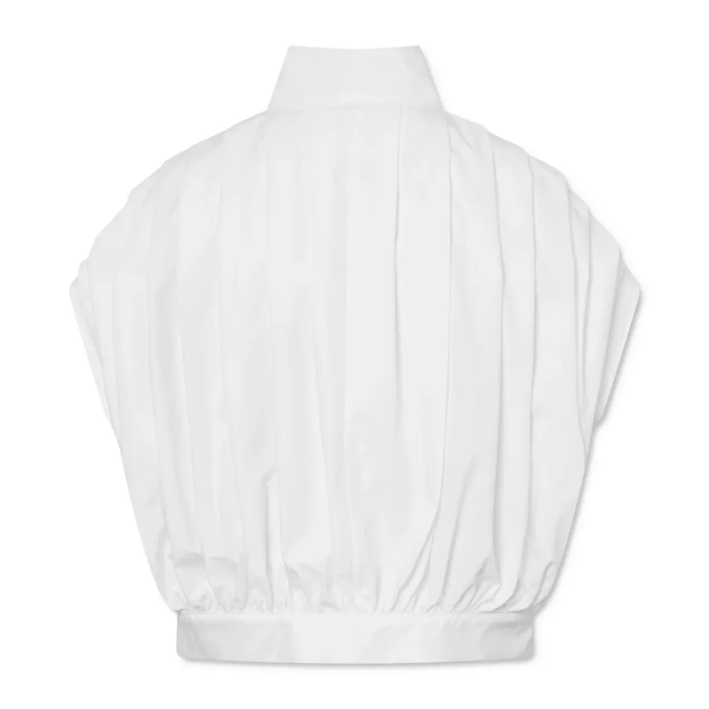 Yndefuld skjorte, der er en hyldest til moderne minimalisme med et poetisk twist. Den høje kravestand og den klassiske knaplukning skaber et rent, sofistikeret udtryk, mens læggene på skuldrene og de fine folder i bunden tilfører skjorten bevægelse og blød volumen. Med korte ærmer og en afslappet silhuet er skjorten både luftig og elegant – ideel til varme dage, hvor stil og komfort skal gå hånd i hånd.
