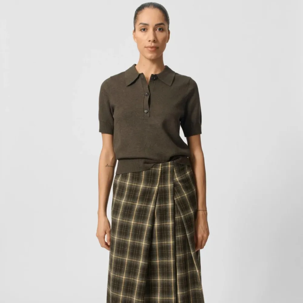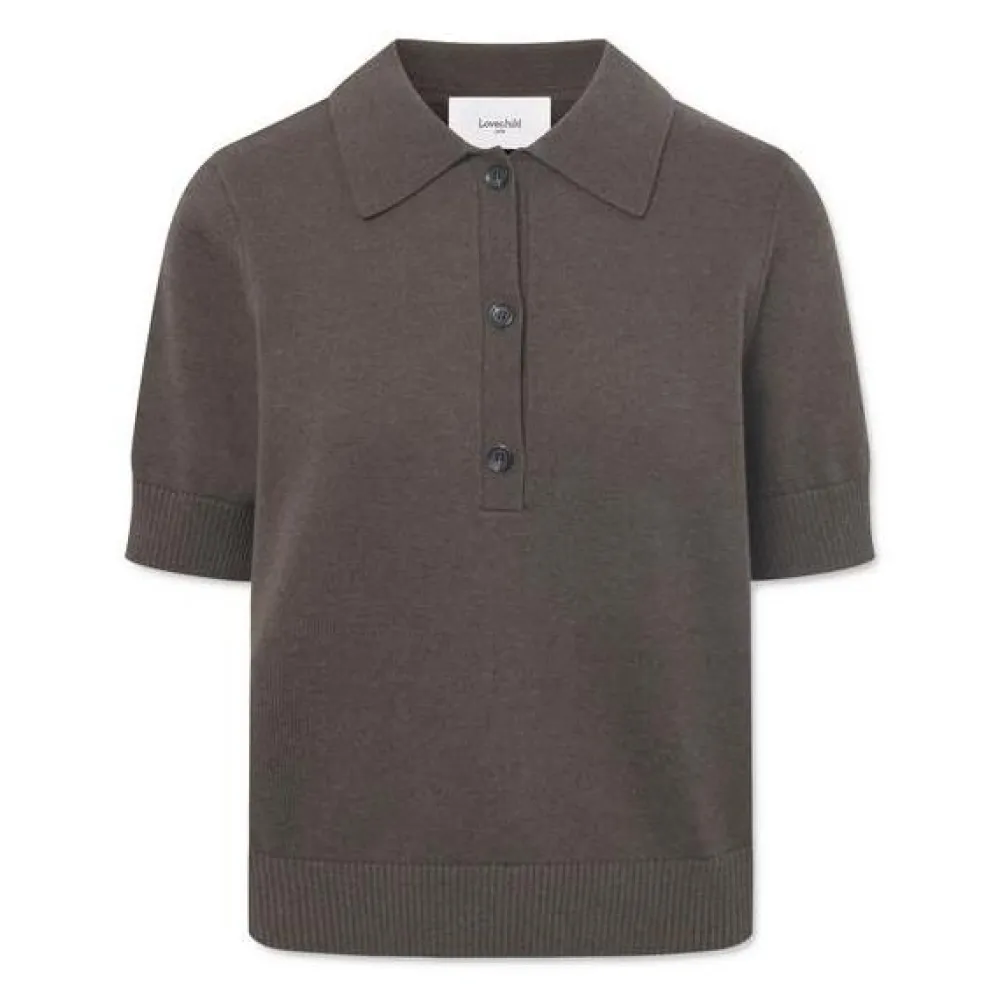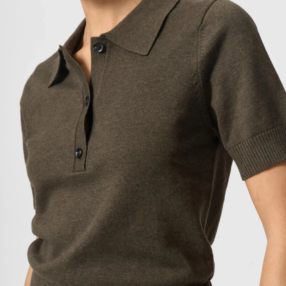 Moderne fortolkning af den klassiske polo – strikket i en blød og holdbar blanding af uld og bomuld. Den mørke farvenuance gør blusen alsidig og tidløs, mens det afslappede snit og de korte ærmer skaber et udtryk, der smukt balancerer mellem casual og sofistikeret. Med sin stilrene stolpelukning, fine ribkanter og klassiske polokrave er blusen ideel til både hverdagsbrug og mere formelle anledninger.