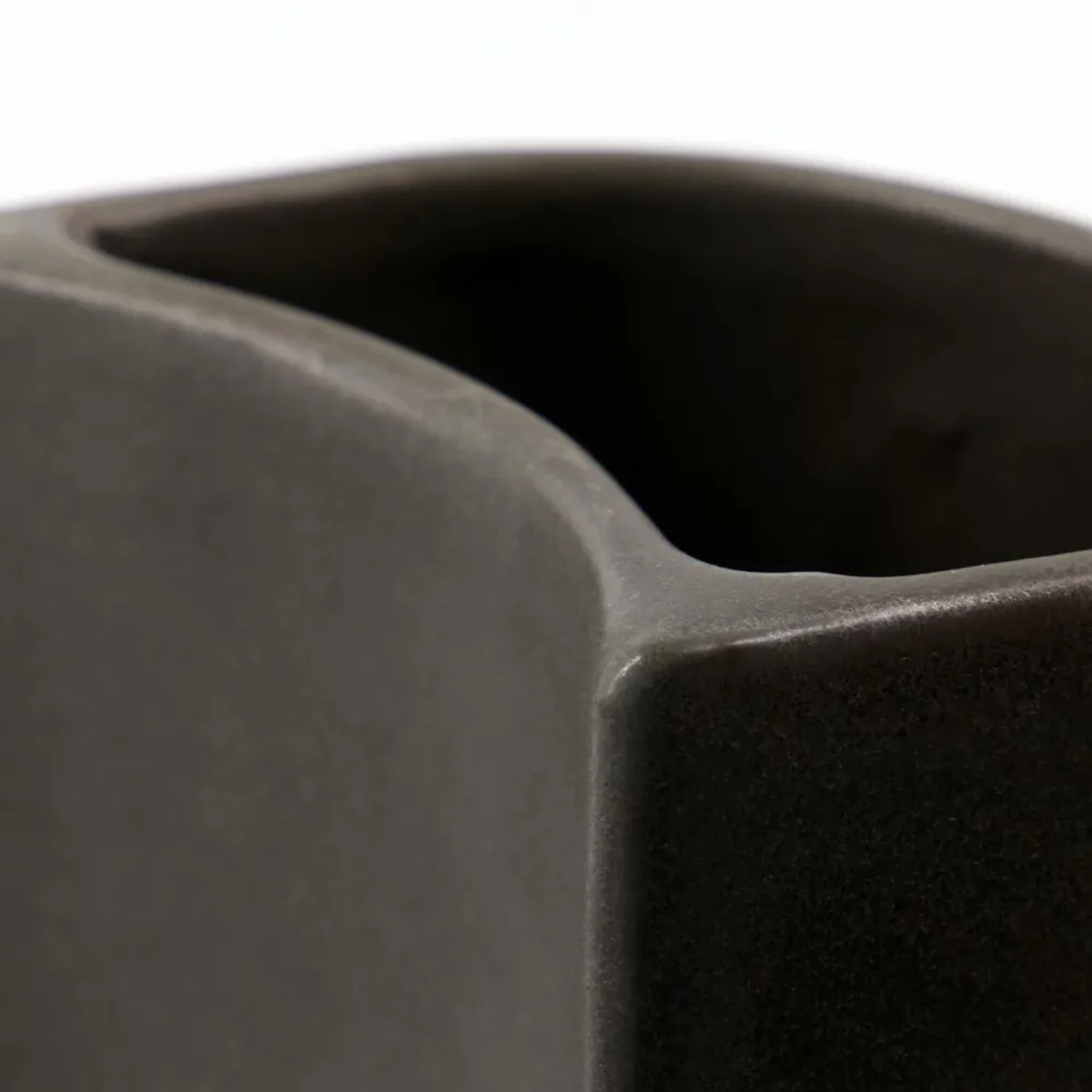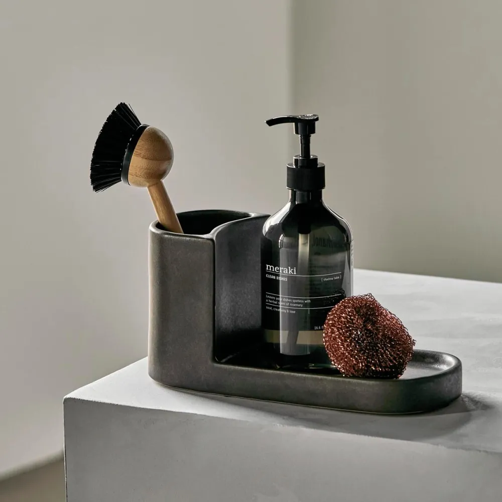 Praktisk børste- og sæbeholder, der forener funktion og æstetik. Den mørkegrå keramik med stentøjsfinish fremhæver det minimalistiske, skulpturelle design, mens den smarte L-form med cirkulær cylinder skaber en æstetisk opbevaringsløsning. Den todelte opdeling sikrer, at både børste og sæbe er organiseret, samtidig med at designet tilfører køkkenet, bryggerset eller badeværelset et roligt og harmonisk udtryk.