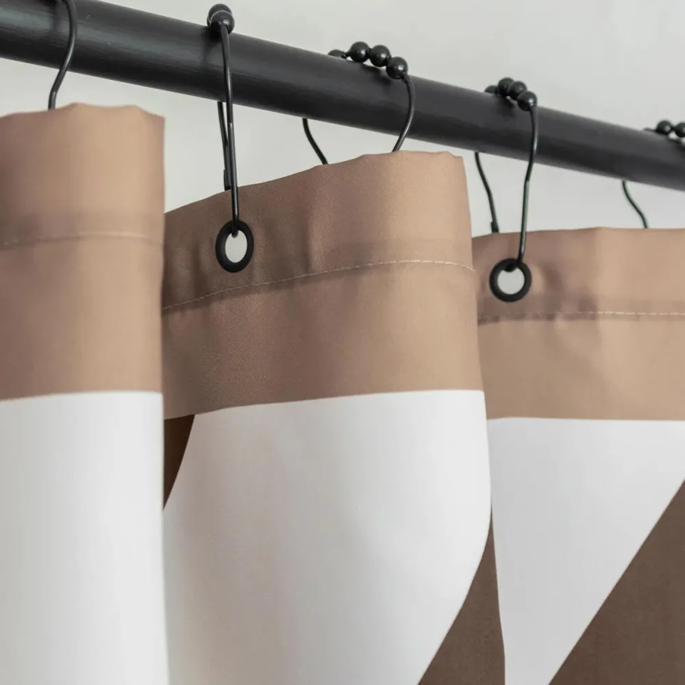 Minimalistisk og grafisk badeforhæng, der fremhæver både funktionalitet og design. Forhænget er udført med diagonale striber i kontrastfyldte farvenuancer, komplementeret af en lysebrun bort med metalringe, som sikrer enkel ophængning. Badeforhænget er skimmel- og vandafvisende, hvorfor det i al sin enkelthed er en stillfuld og praktisk løsning.