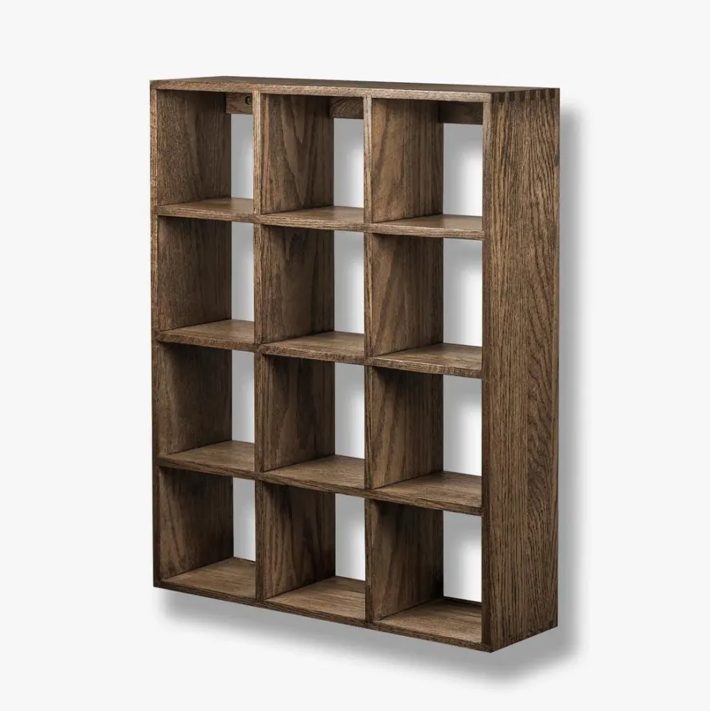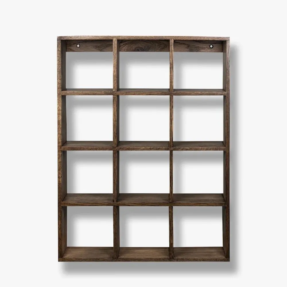 Tidløs sættekasse, der på fineste vis kombinerer elegance og funktionalitet. Fremstillet i smukt mørkolieret eg med fingertappede samlinger, forener den håndværk og æstetik i ét tidløst design. De 12 kvadratiske rum muliggør plads til opbevaring og fremvisning af alt fra yndlingskrus til små skatte. Det åbne design, tillader væggens farve at skinne igennem og skaber et let, harmonisk udtryk, der elegant smelter sammen med indretningen, uanset hvilket rum kassen placeres i. Hvert stykke egetræ bærer på sin egen karakter med naturlige variationer i farve, knuder og årer, hvilket gør hver kasse unik – et subtilt, men markant statement i hjemmet.