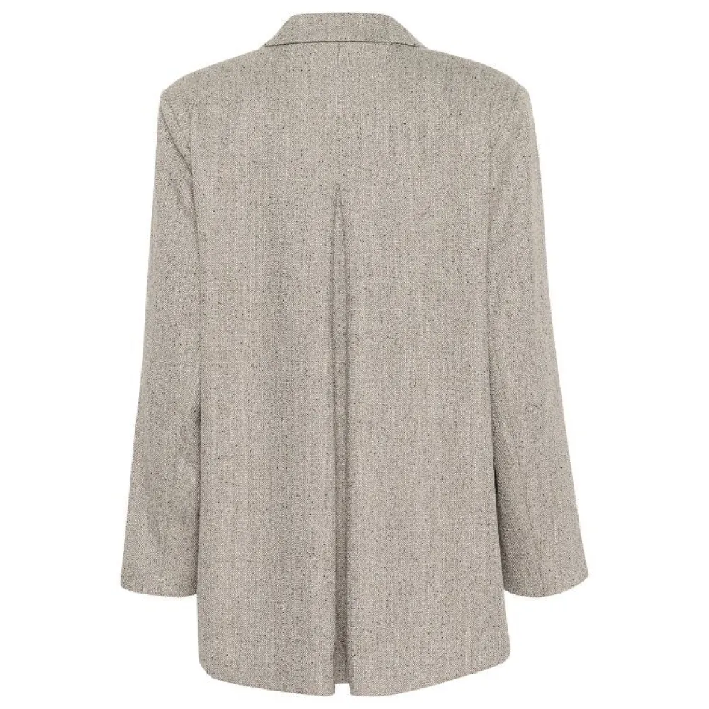Emmy-blazeren har en struktureret silhuet med klassisk reverskrave, klaplommer og dobbeltradet knaplukning foran. Den A-formede pasform og hoftekorte længde giver et moderne og flatterende udtryk, mens de let vatterede skuldre og det forlængede bagstykke skaber en skarp, velklædt silhuet – perfekt til lag-på-lag styling.