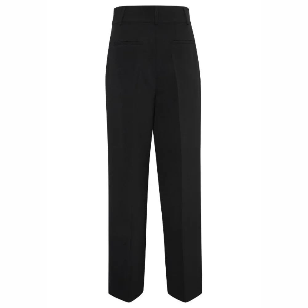 Opgrader din garderobe med disse klassiske, skræddersyede bukser i sort, designet med ekstra høj talje og brede ben for et elegant og moderne udtryk. Bukserne har en formsyet pasform omkring talje og hofter, som fremhæver din silhuet på smukkeste vis. Fine læg foran og to sidelommer giver et stilrent look, der fungerer både til hverdag og fest.