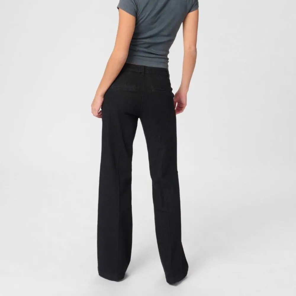 Disse jeans med vide ben kombinerer en afslappet pasform med et stilrent, struktureret udtryk. De har en mellemhøj talje og elegante paspolerede baglommer, der tilfører et skræddersyet præg. Den fulde benlængde giver et sofistikeret look, mens den løse pasform og det bløde bomuldsstretch sikrer komfort hele dagen. Perfekte til både hverdag og mere polerede outfits. Farven er en klassisk sort vask, som er nem at style med alt i garderoben.