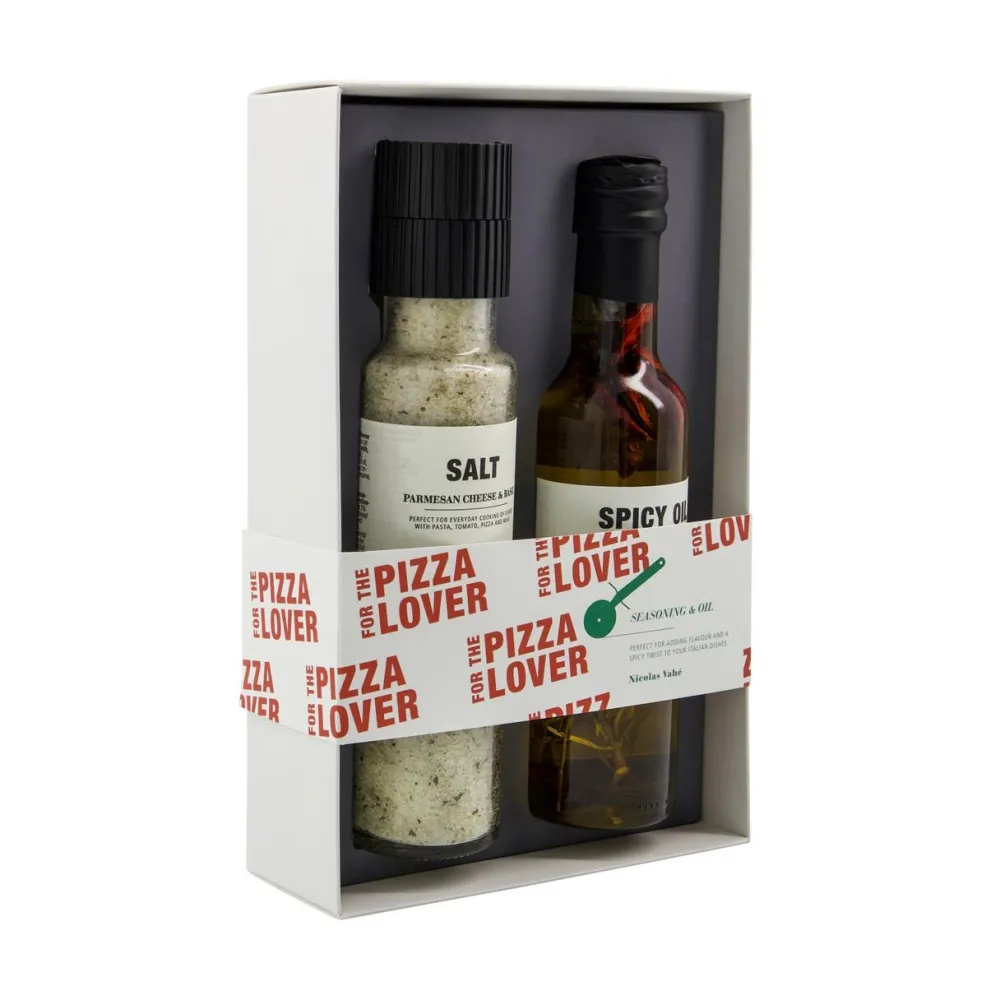 Forkæl enhver pizzaentusiast med denne gaveæske, der muliggør tilføjelse af unikke smagsoplevelser i madlavningen. Sættet indeholder en krydret olie, fremstillet med en blanding af solsikke- og olivenolie, rosmarin, chili og timian, hvilket giver et diskret kick til enhver ret. Herudover medfølger en salt, der er beriget med parmesan og basilikum, som tilfører en rig og fyldig smag til pizza og andre retter. Gaveæsken er ideel for enhver, der brænder for at lave pizza, og den sikrer, at madretterne altid er smagfulde.