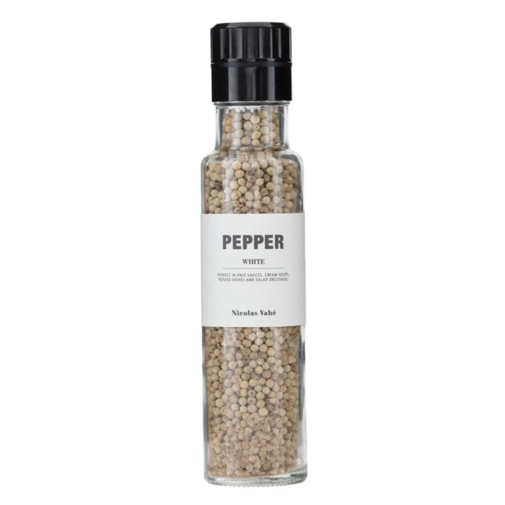 Lækker Nicolas Vahé hvid peber, der giver en udsøgt smag til dine retter. Den smagfulde peber er perfekt til hvide saucer, cremede supper, kartoffel retter og salat dressinger. Nicolas Vahé’s hvide peber derfor uundværlig i køkkenet og den er ydermere utrolig flot at have stående fremme med dens smarte emballage.