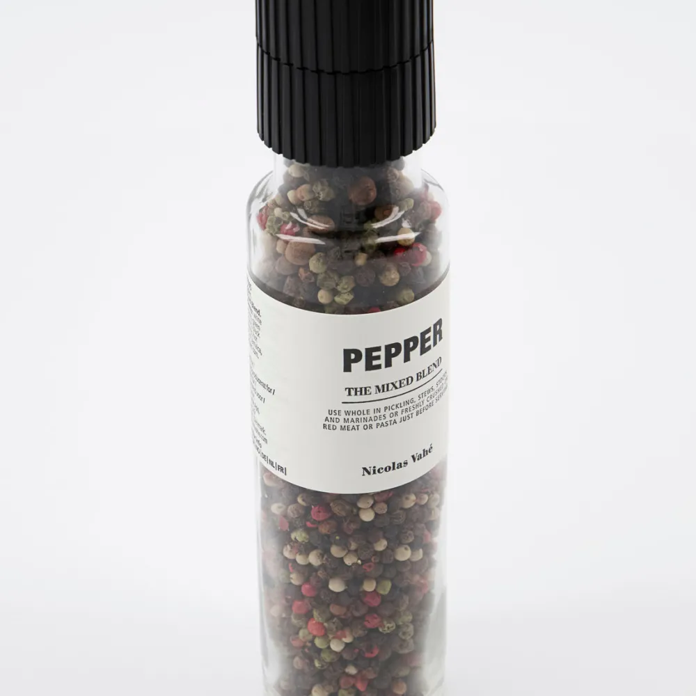 Nyd den klassiske pebermix fra Nicolas Vahé med fem forskellige slags peber: hvide, røde, grønne, rosa og sorte peberkorn. Pebermix er en klassiker sammen med Nicolas Vahés populære franske salt og det perfekte tilbehør til spisebordet. Peberen kommer i en smart kværn, således at man altid kan tilføje lidt ekstra god smag til madlavningen – nemt og hurtigt. Blandingen kommer med en keramisk kværn, som giver fint kværnede krydderier. Dette frigiver olierne, således at maden får mere aroma og smag.