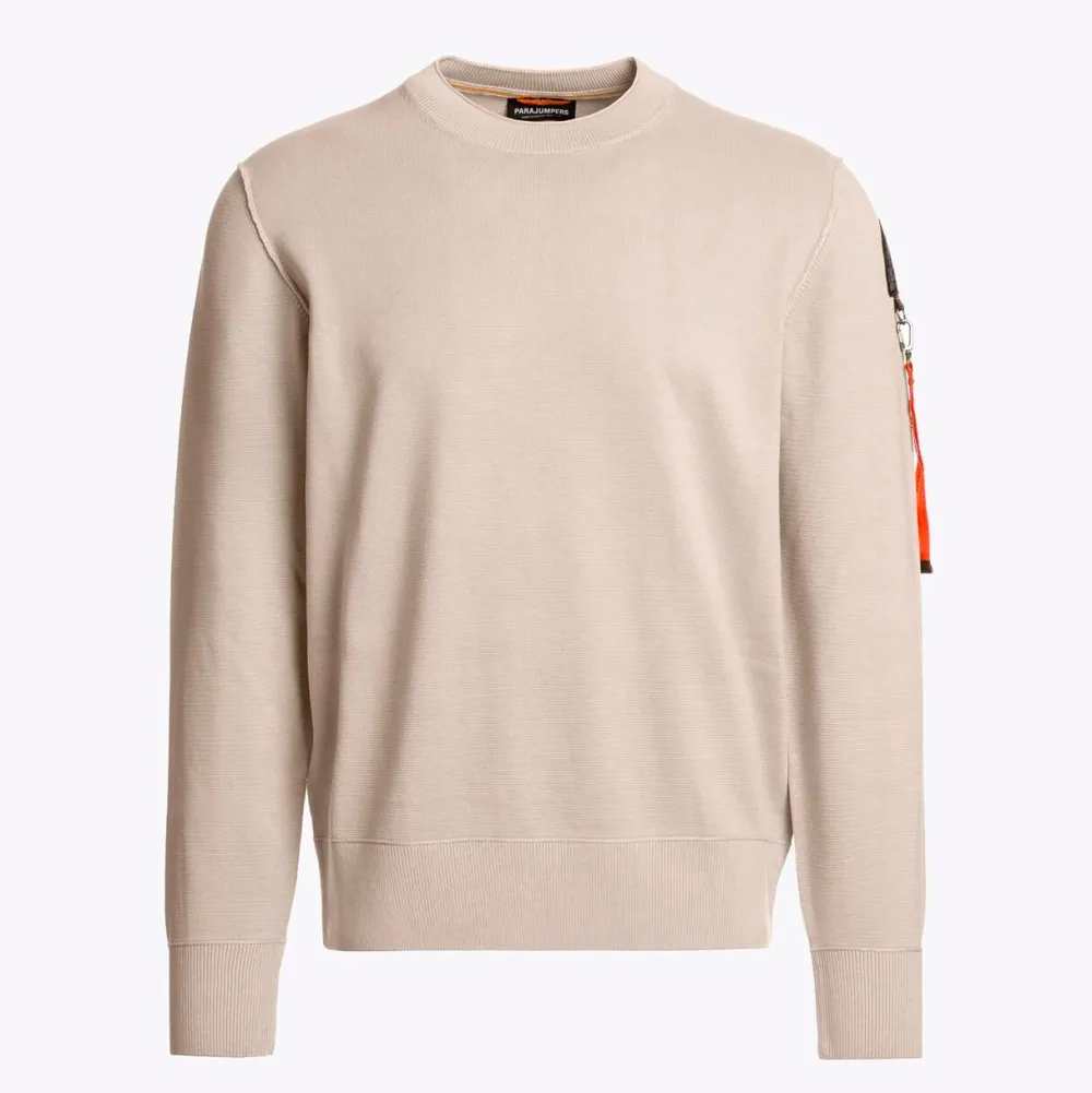 Enkel og moderne strik i et raffineret udtryk. Sweateren er garment dyed og enzymvasket, hvilket tilfører dybde i farven og en let tekstur, der gør hver model unik. Den tætte Milano-strik giver en struktureret overflade og en skarp silhuet. Ribkanter ved manchetter og bund sikrer en velafbalanceret pasform, mens de ikoniske Parajumpers-signaturer – logoet på ærmet og den orange rescue puller – tilfører et markant, men sofistikeret finish.