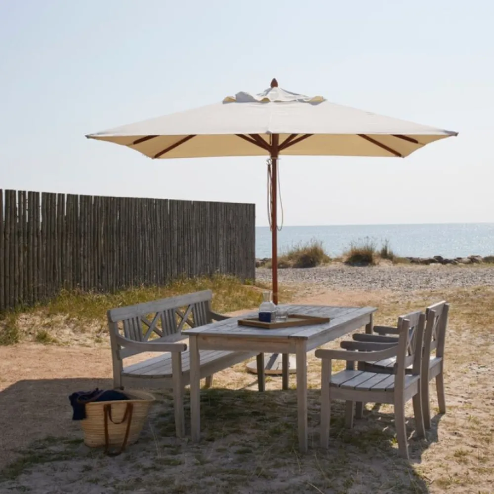Tidløst og klassisk bord, der udtrykker en omhyggelig balance mellem nordisk nostalgi og moderne enkelhed. Det rektangulære bord er fremstillet i FSC-certificeret teak og designet i samarbejde med Mogens Holmriis. Bordet er udført med et praktisk hul i midten, hvori der med fordel kan placeres en parasol.