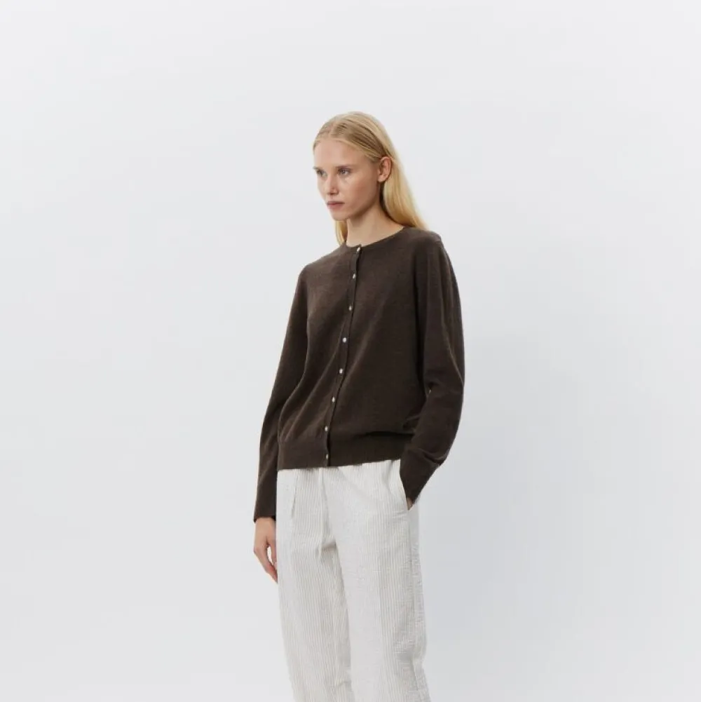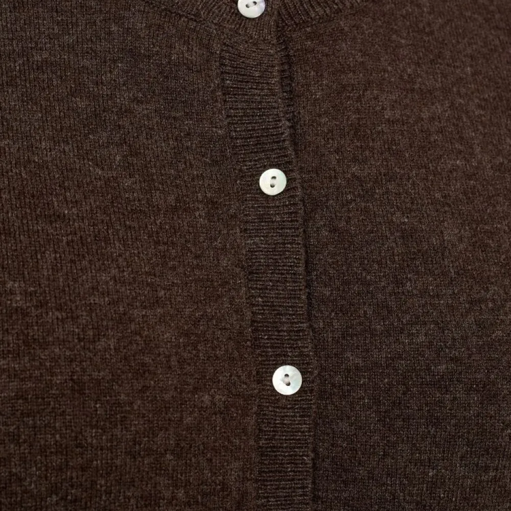 Cardiganen har et enkelt og tidløst design med lange ærmer, regular fit og knaplukning foran, hvilket gør den nem at style – både lukket over en top eller åben over en kjole eller skjorte. Det brune ulddesign gør den perfekt til både arbejde og hverdagsbrug, hvor du ønsker et elegant, men afslappet udtryk.