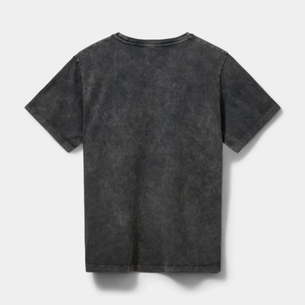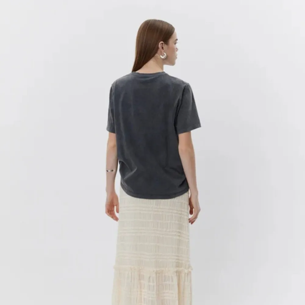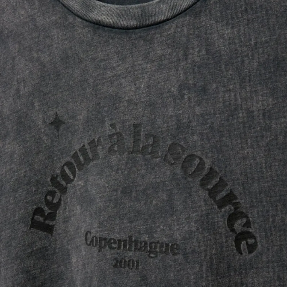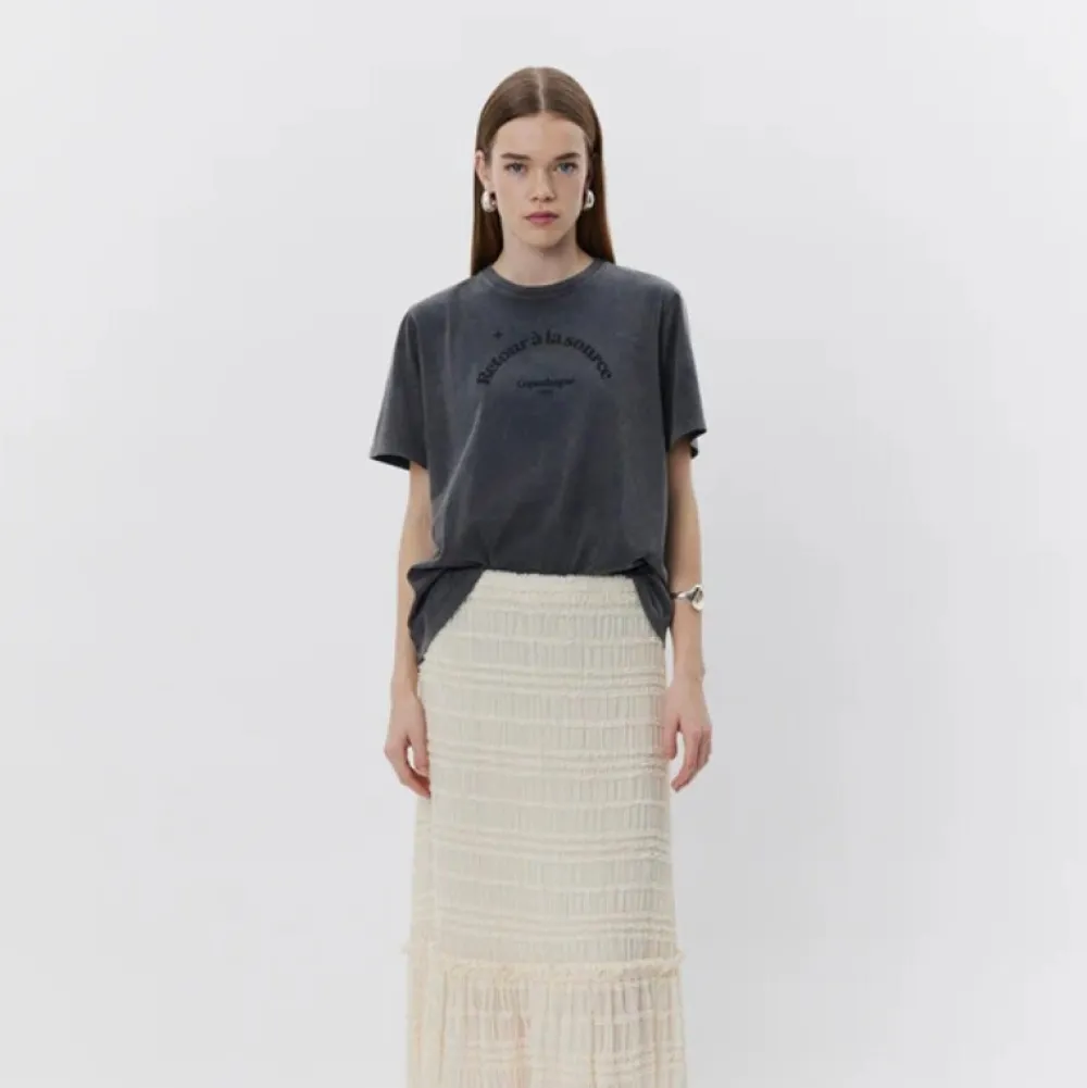 T-shirt i forvasket sort med et afslappet, cool udtryk. Designet har rund hals, korte ærmer og et sort tekstprint på brystet med ordene “Retour à la source, Copenhague 2001”. Fremstillet i blød bomuld med en behagelig relaxed pasform – perfekt til både jeans og nederdele.