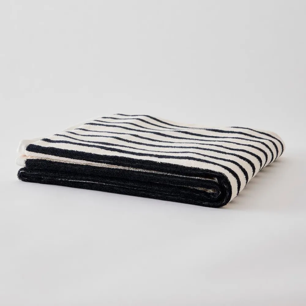 Æstetisk og tidløst håndklæde, der kombinerer naturlig skønhed med funktionel luksus. Fremstillet i 100% økologisk bomuld og vævet i en blød frotté med diskrete striber, giver det en sanselig oplevelse og en rolig æstetik til badeværelset.