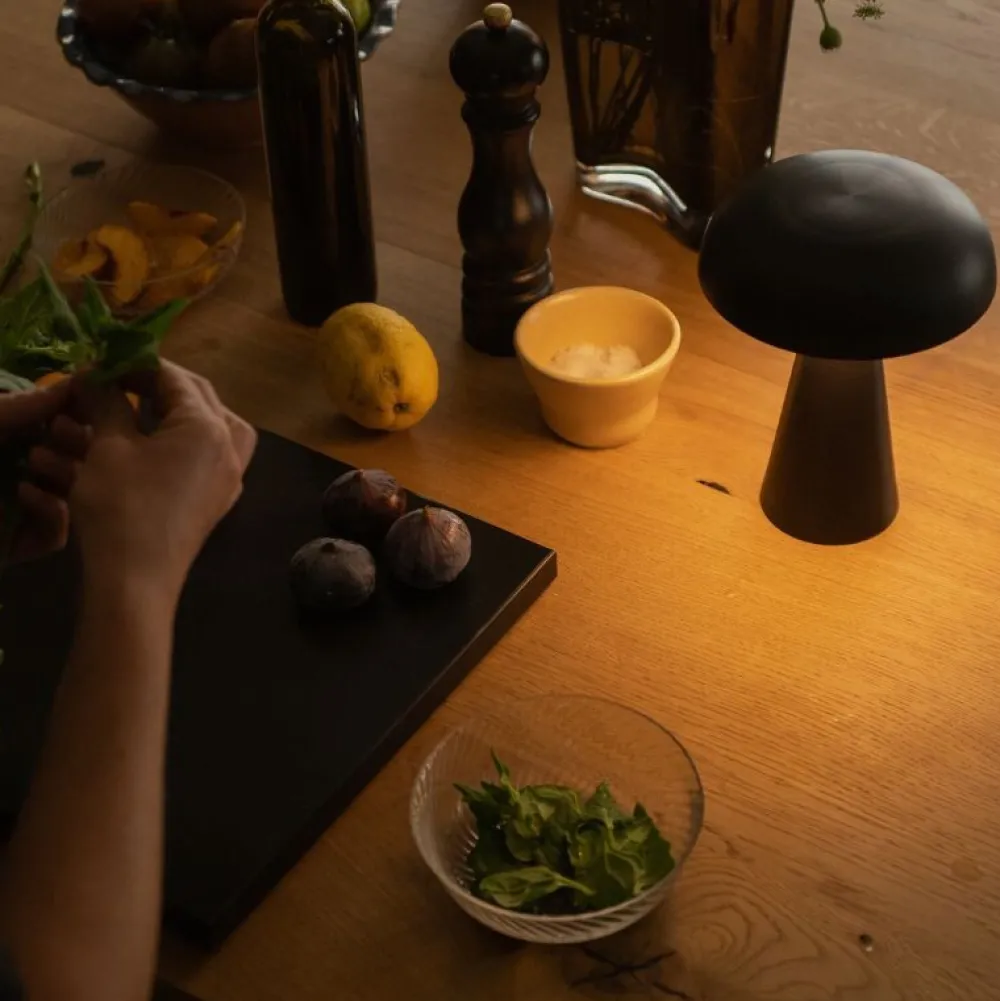 Match belysning og stemning med Como, en bærbar bordlampe designet af Space Copenhagen. Fremstillet af anodiseret aluminium, spidser Comos robuste base op mod en blødt buet, svampeformet skygge. Como kan fås i seks forskellige udgaver: Black, Brass, Bronzed, Red Brown, Stone Blue og Aluminium.