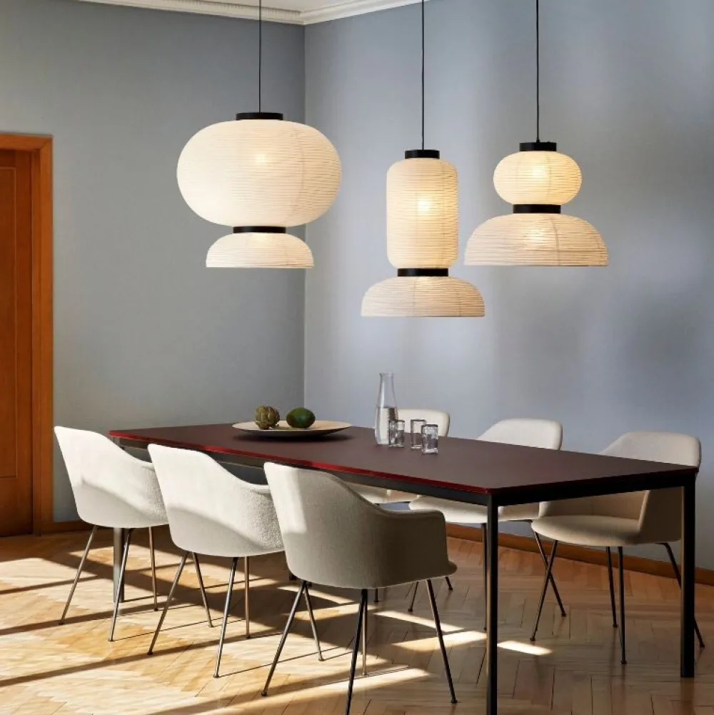 Håndlavet med rispapir, der blander forskellige størrelser og former sammen. Serien består af tre forskellige lanterneversioner og en bordlampe i elfenben-hvidt papir med sortbejdset egedetaljer.
