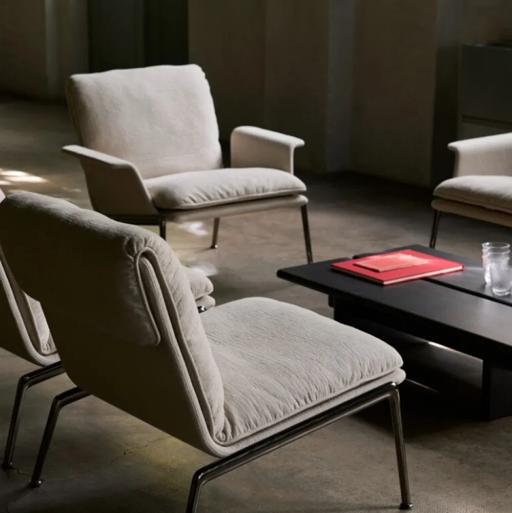 Kendetegnet ved sine plyspuder og slanke, støbte aluminiumsben, tilbyder Muno loungestolen den samme overbevisende oplevelse som sin højere modstykke i en mere kompakt form. Ved at have en enkelt hynde ser stolens sæde og ryglæn ud, som om den var draperet over stellet for at opnå et afslappet, men elegant udtryk.