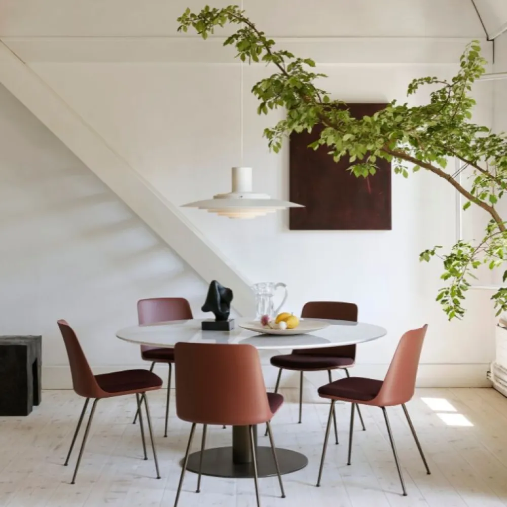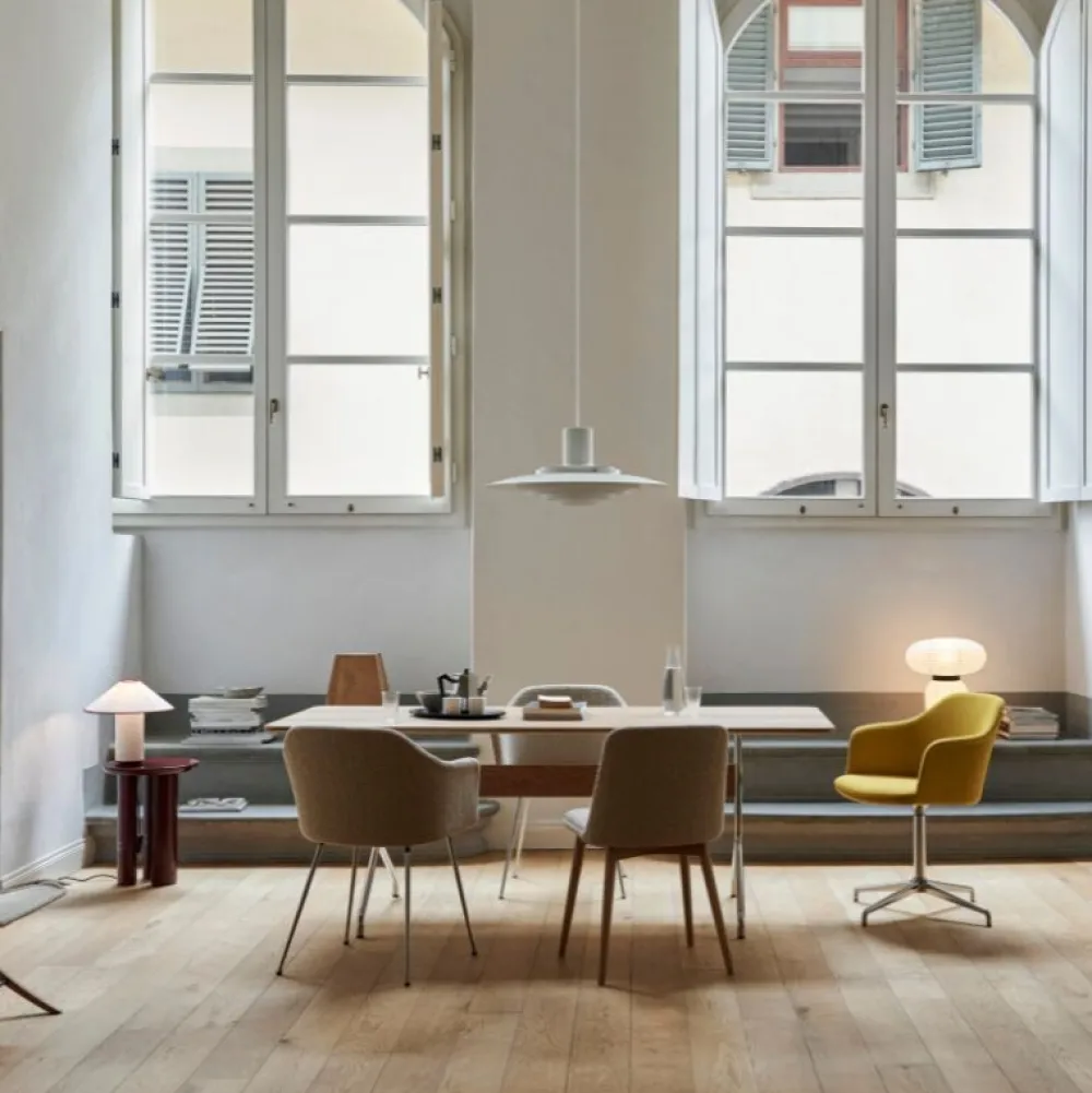 Oprindeligt udtænkt i 1963, fem koncentriske nuancer skaber gradueringer af kurver mod midten af lampen for at udsende et blødt, diffust lys. Den diskrete placering af nuancerne og den silkebløde aluminiumsfinish kulminerer i et sammenhængende udtryk, der er både ikonisk og medrivende.
