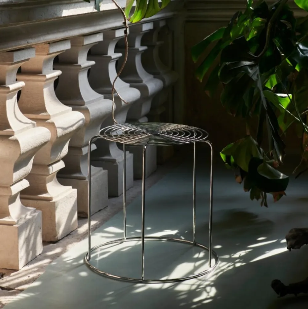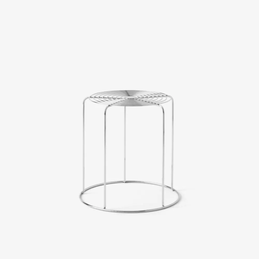 Det, der gør Wire Stool umiskendelig Verner Panton, er brugen af rustfrit ståltråd til at skabe en enkel geometrisk form med gentagne mønstre i en stabelbar skammel, der tilmed fungerer som et smukt sidebord.