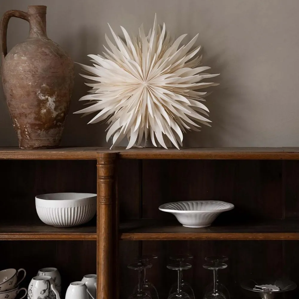 Yndig og dekorativ papirstjerne i et detaljeret, folkloristisk design. Stjernen er udført med tynde detaljer, der minder om flammer. Lad stjernen pynte smukt i vinduet, når rimfrosten vokser udenfor. Ved indsættelse af lyskilde spredes et lunt og stemningsfyldt lys.