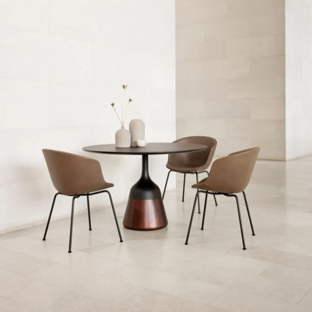 Unik og rummeligt spisebord. Coin Dining Table fusionerer cirkulære og kegleformede komponenter. Coin er et geometrisk minimalistisk spisebord som smelter sammen, mens det skiller sig ud. Støbt i aluminium, enten sortpoleret med messingfinish eller pulverlakeret i sort eller brun.