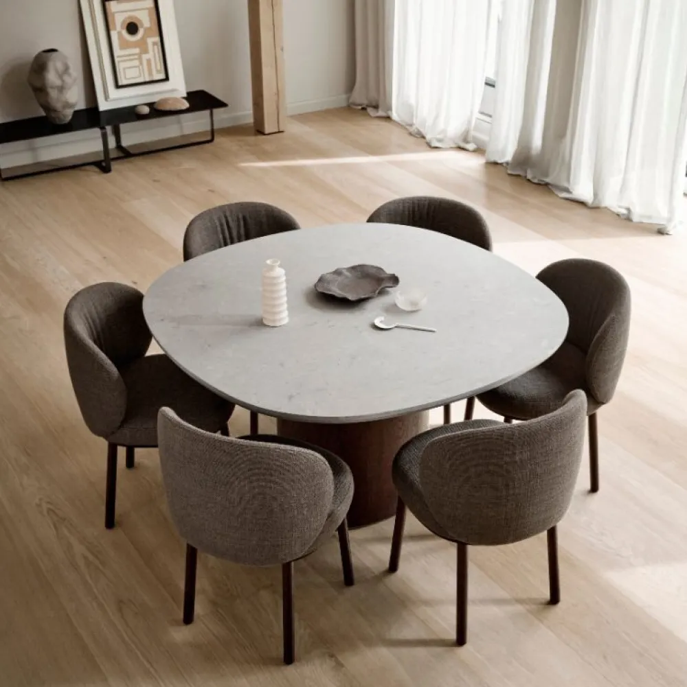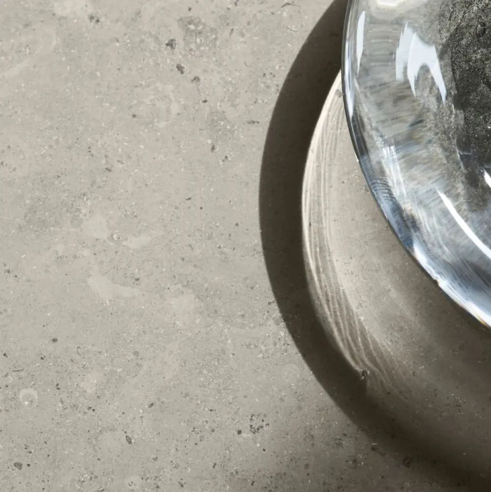 Ovata-bordet har en enkel bordplade støbt i matpoleret, grå Jura-kalksten. Bordpladens karakteristiske, beroligende og afrundede form afspejles i den robuste søjlebase, som udstråler en diskret, luksuriøs følelse.