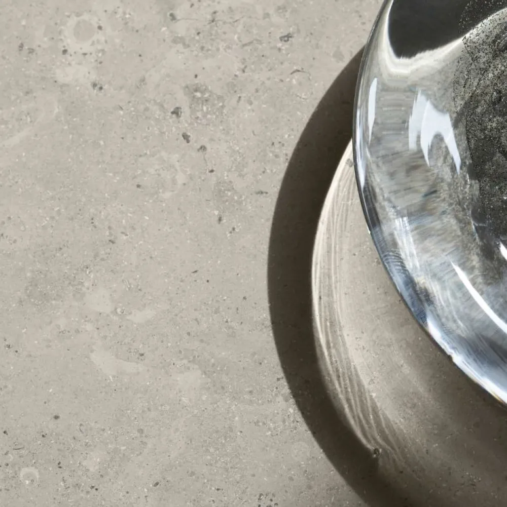 Ovata-bordet har en enkel bordplade støbt i matpoleret, grå Jura-kalksten. Bordpladens karakteristiske, beroligende og afrundede form afspejles i den robuste søjlebase, som udstråler en diskret, luksuriøs følelse.