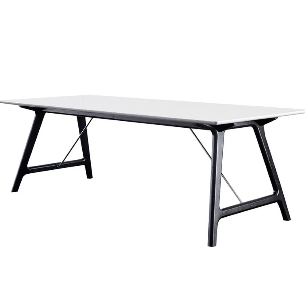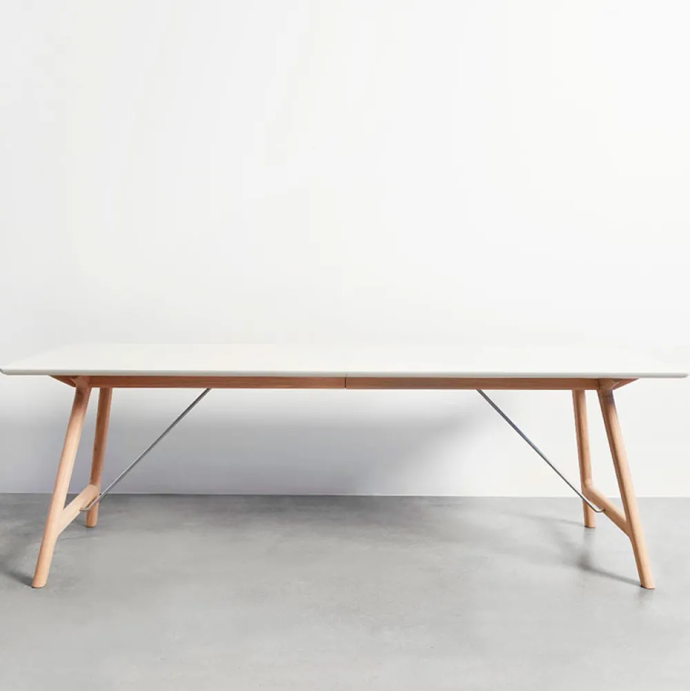 Bordpladen er fremstillet af gennemfarvet hvid laminat og understellet er i massivt eg. Udtræksbordet er behandlet med Wood Care overfladebehandling, som kræver minimal vedligeholdelse. Der er udtræk til tillægsplader, som let isættes og hurtigt giver ekstra plads ved bordet.