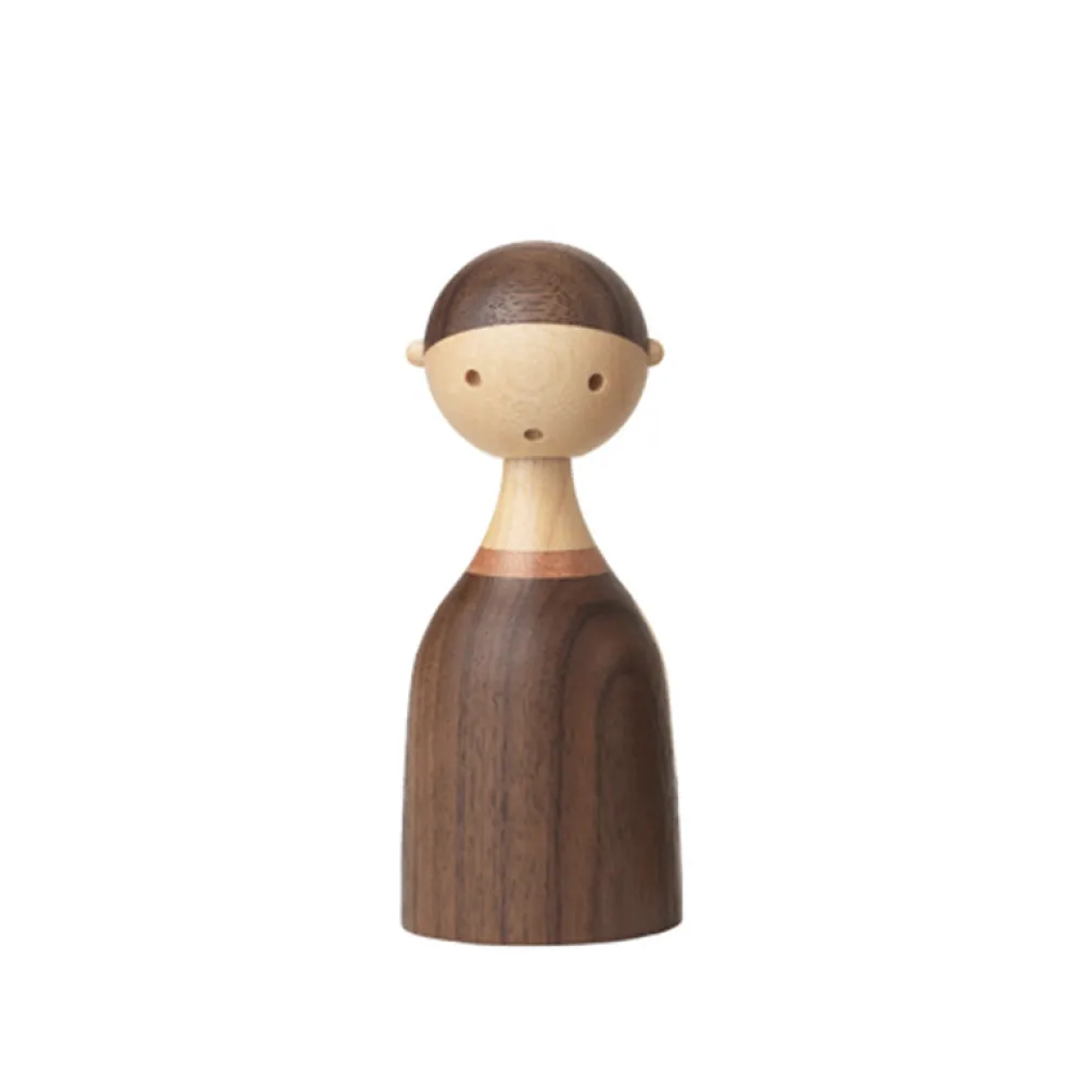 Figur af dreng fra Architectmades nye serie KIN. KIN er en skøn serie med figurer for hele familien, hvor de fine figurer kan skifte udtryk med deres vippende hoveder. Fremstillet af valnød, mahogni og ahorn.