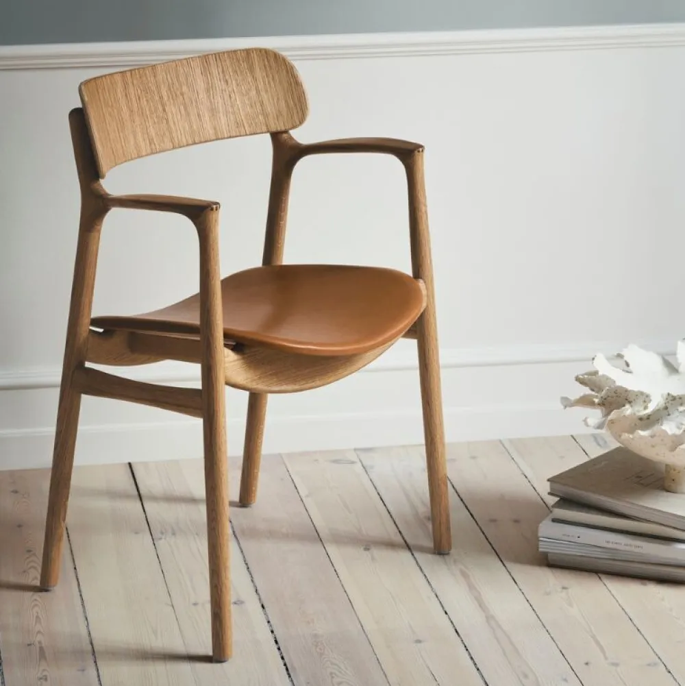 Komfortabel træstol med elegante detaljer. Stolens sæde og ryglæn er elegant designet til at give støtte og god bevægelsesfrihed i forskellige siddestillinger.