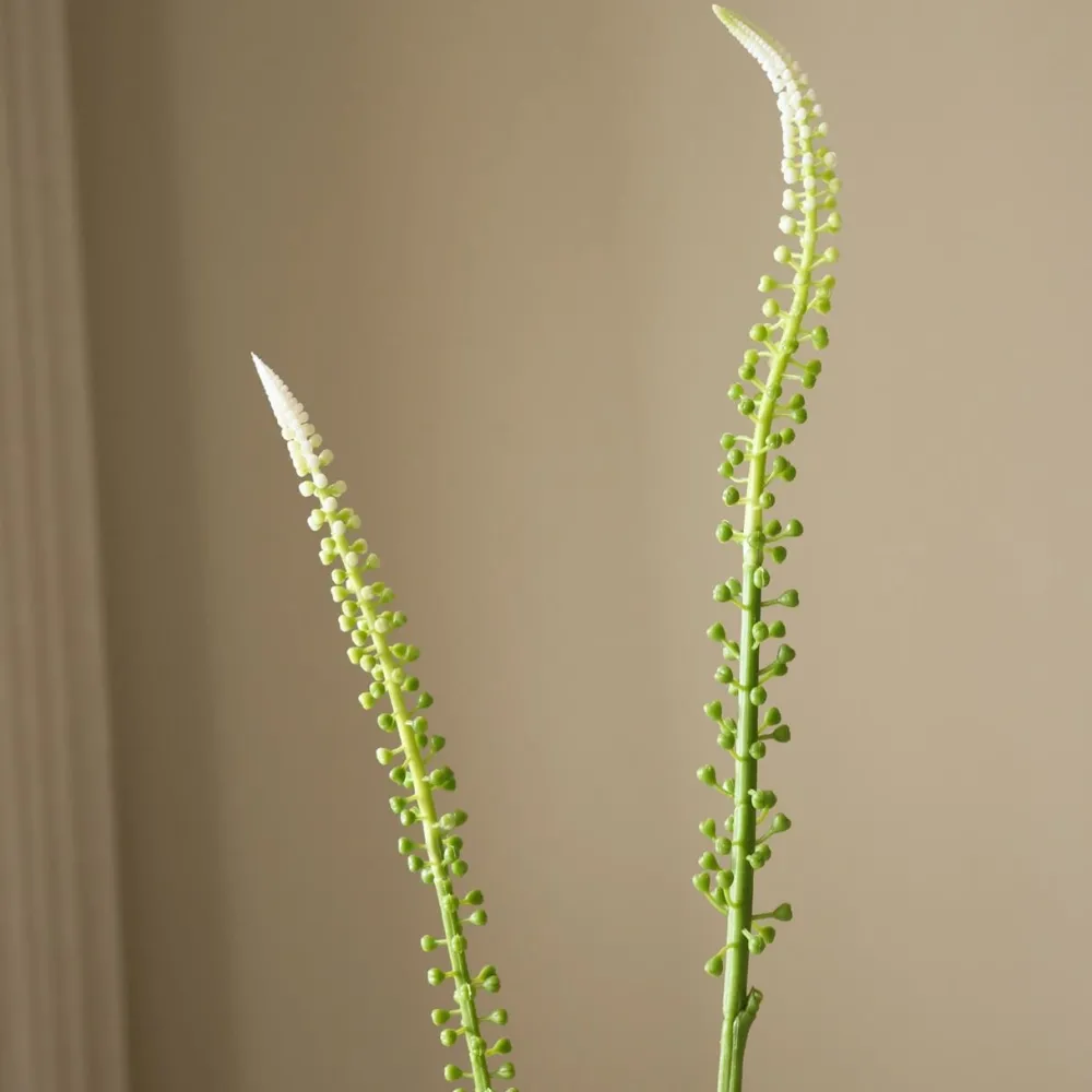 Elegant og iøjnefaldende blomst, der emmer af magisk elegance. Med to aflange blomsterpigge med en gradient af små, tæt klyngede knopper, der i bunden går fra grønne til hvide i spidserne.De slanke, let buede grønne stængler strækker sig opad og understøtter den sarte blomsterstruktur, hvilket giver et let, men alligevel imponerende udtryk. Blomsten er en fin tilføjelse til ethvert rum, hvor der ønskes et strejf af naturens stilfulde skønhed.