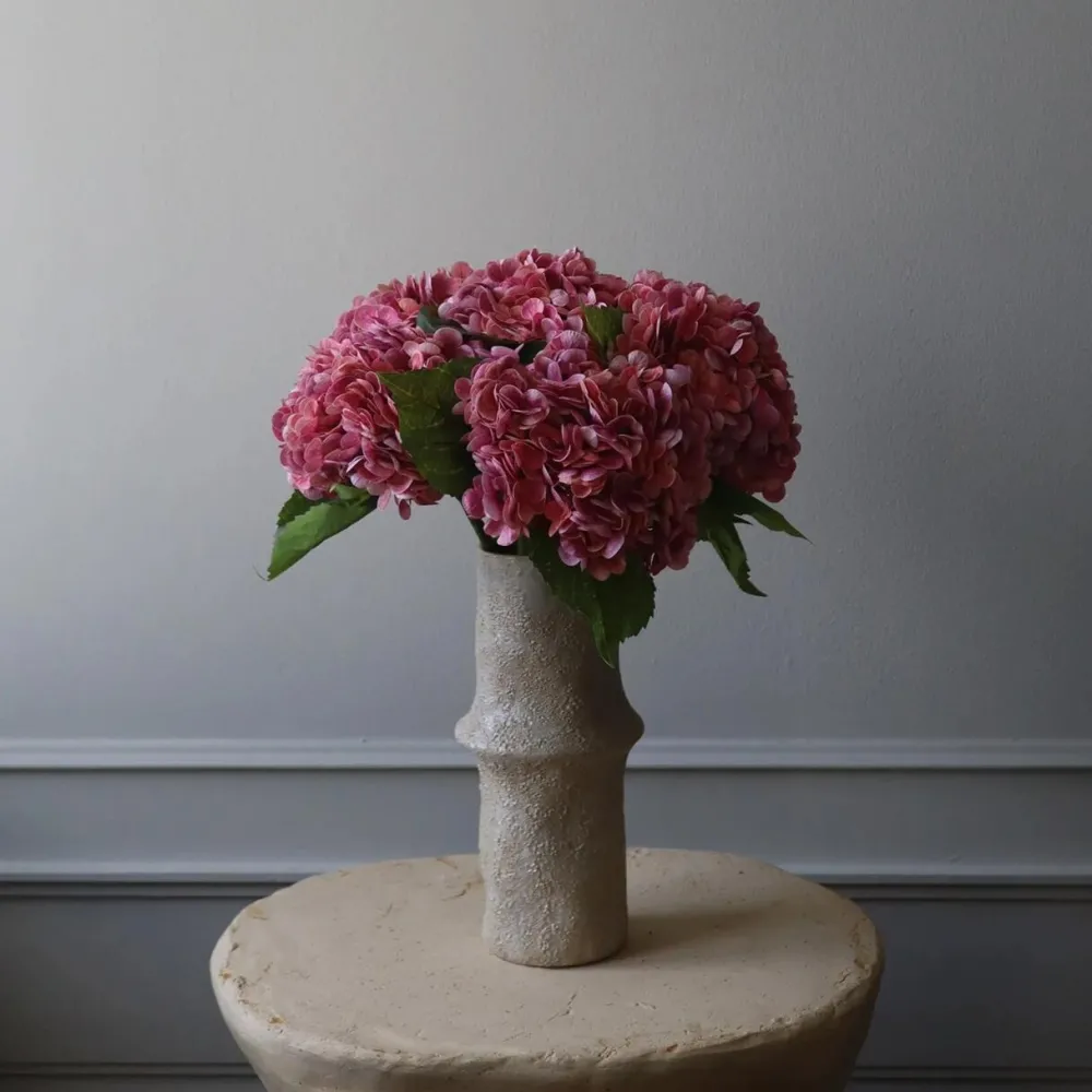 Yndefuld og fortryllende Hortensia-blomst, der på fineste vis komplementerer enhver setting i boligindretningen. Det fulde blomsterhoved er fyldt med detaljer – herunder individuelle kronblade og naturtro tekstur, der inviterer til berøring. Bladene er skabt med autentiske årer og en levende farvenuance, der bidrager til et livagtigt udseende. Blomsten er designet til at være alsidig, hvorfor stilken kan bøjes og formes efter eget ønske. Lad kreativiteten blomstre!
