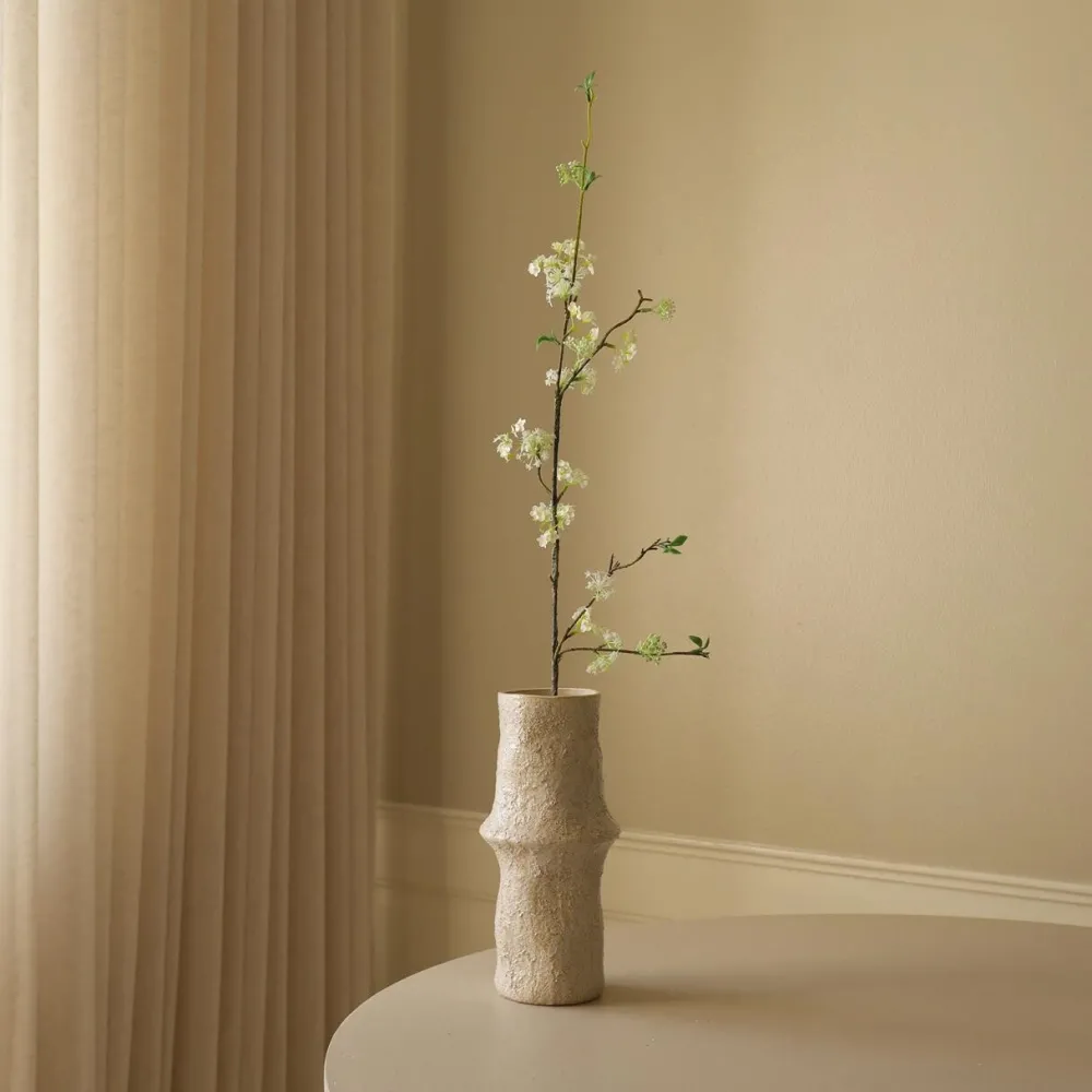 Fin og enkel gren, der er prydet med små, hvide blomster – en fængslende botanisk accent, der bringer vinterens renhed og elegance til ethvert rum. Hver gren har delikate klynger af uberørte blomster, der ligger midt i det bløde, snehvide løv, hvilket skaber en fredfyldt og fortryllende visning. Grenen er designet til at være alsidig, hvorfor stilken kan bøjes og formes efter eget ønske.