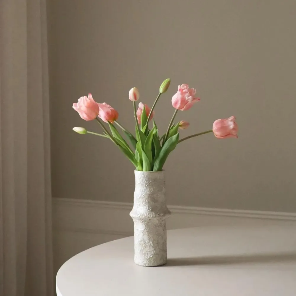 Yndefuld buket, der præsenterer fine, lyserøde tulipaner med let krusede kronblade, arrangeret med fokus på blomsternes naturlige form og bevægelse. De bløde blush-toner flyder elegant sammen i en fin farvegradient, der bringer varme og lethed til udtrykket. Friske grønne stilke og blade fremhæver tulipanernes sarte farvespil og tilfører en naturlig balance til kompositionen. Resultatet er en buket, der udstråler romantik, ro og enkel skønhed. Et poetisk indslag, der bringer foråret ind – uanset årstid.