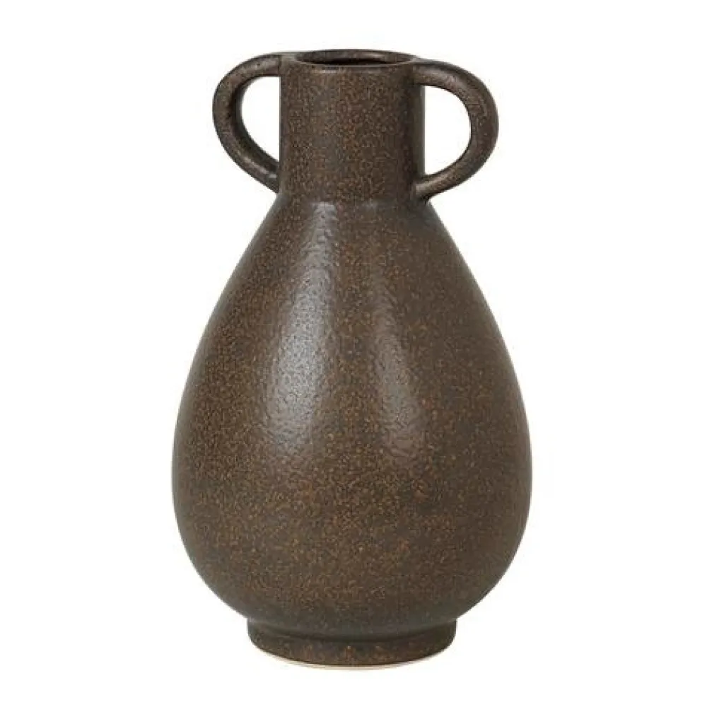 Smuk og skulpturel vase, der bringer en følelse af skandinavisk charme til boligindretningen. Som følge af den mørkebrun patinering har den keramiske vase en iøjnefaldende antik vibe. Vasen har et utal af anvendelsesmuligheder, men den kan med fordel benyttes til skulpturelt pynt eller med flotte, langstilkende blomster – både friske og tørrede.