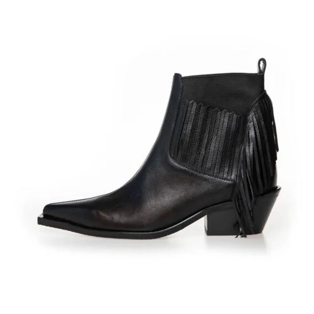 En støvle, der emmer af attitude og stil. Støvlerne forener western-inspirerede detaljer med et moderne udtryk, hvor de markante frynser skaber dynamik og kant. Den spidse snude og vinklede hæl understreger det cool cowgirl-look, mens elastikken i siderne giver både fleksibilitet og en komfortabel pasform. En edgy signaturstøvle, der uden besvær løfter ethvert outfit.
