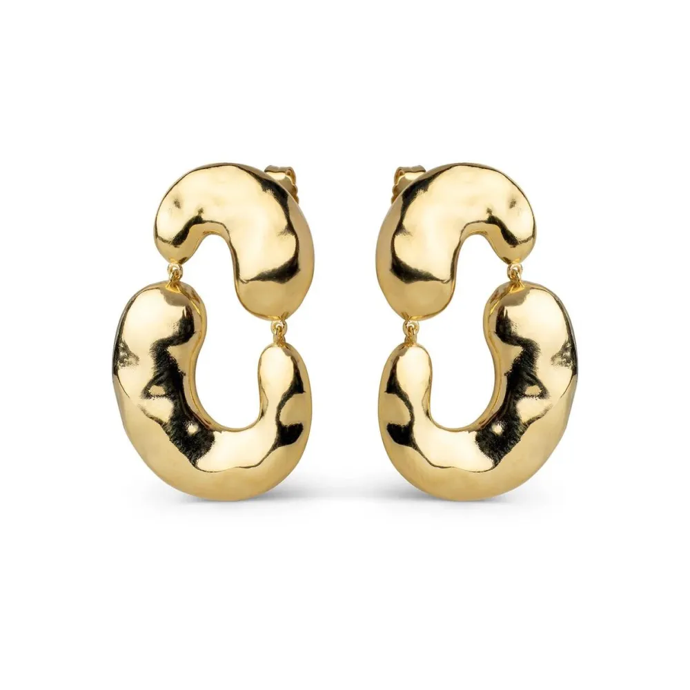 Skulpturelle øreringe, der forener styrke og elegance i et organisk formsprog. De to store, bløde elementer er forbundet i en svungen bevægelse, der minder om flydende metal – levende, sanseligt og fuld af karakter. Den blanke overflade reflekterer lyset smukt og giver dybde til designet, mens den lette konstruktion gør øreringene behagelige at bære, trods sit markante udtryk. Et smykke med volumen, personlighed og moderne sensibilitet – skabt til den, der tør bære noget ekstraordinært med ro og raffinement.